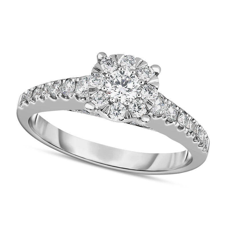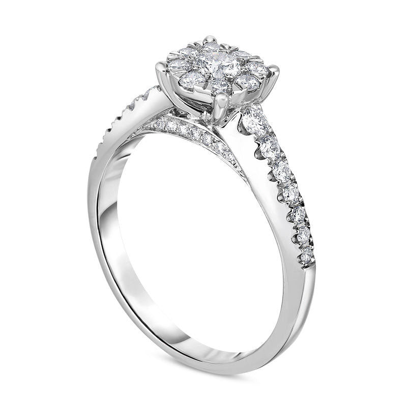 Present your beloved with a breathtaking symbol of your love and commitment with this stunning diamond engagement ring. Crafted in elegant 10K white gold, this exquisite design flaunts a radiant 1/10 ct. center diamond embraced by a shimmering halo of smaller diamonds. The tapered shank glimmers with a row of diamonds that line the facing edge and sides, amplifying the ring's brilliance from every viewpoint. Sparkling with a total weight of 5/8 ct. t.w., this engagement ring exudes feminine charm and is polished to a brilliant luster, making it the perfect choice for the woman you adore.