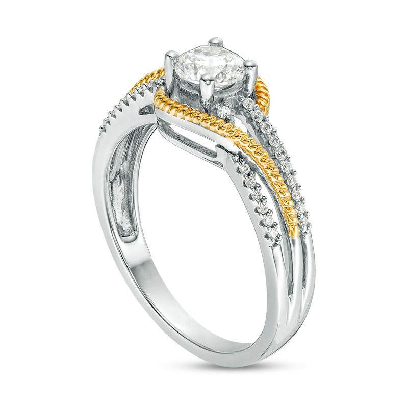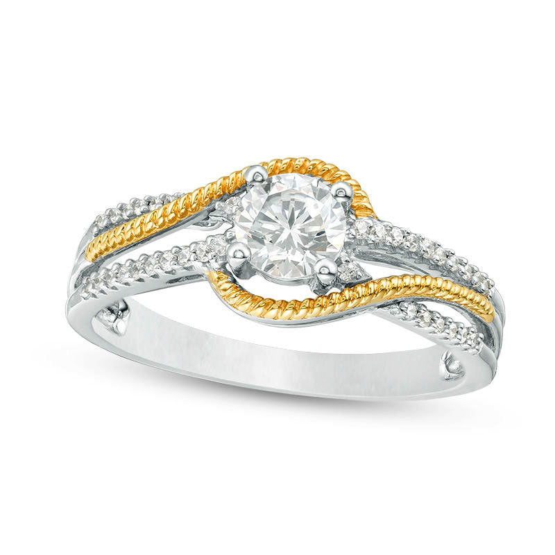 Looking for a unique engagement ring that breaks the mold? Check out this stunning piece crafted in 14K two-tone gold. The center of the ring features a dazzling 1/2 ct. diamond, supported by a split shank of smaller diamonds in white gold. Surrounding this centerpiece are yellow gold ribbons with a textured rope design, creating an eye-catching bypass effect. With a total of 5/8 ct. of diamonds, this ring is sure to shine bright and make a lasting impression.
