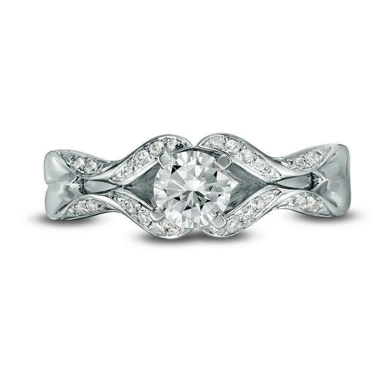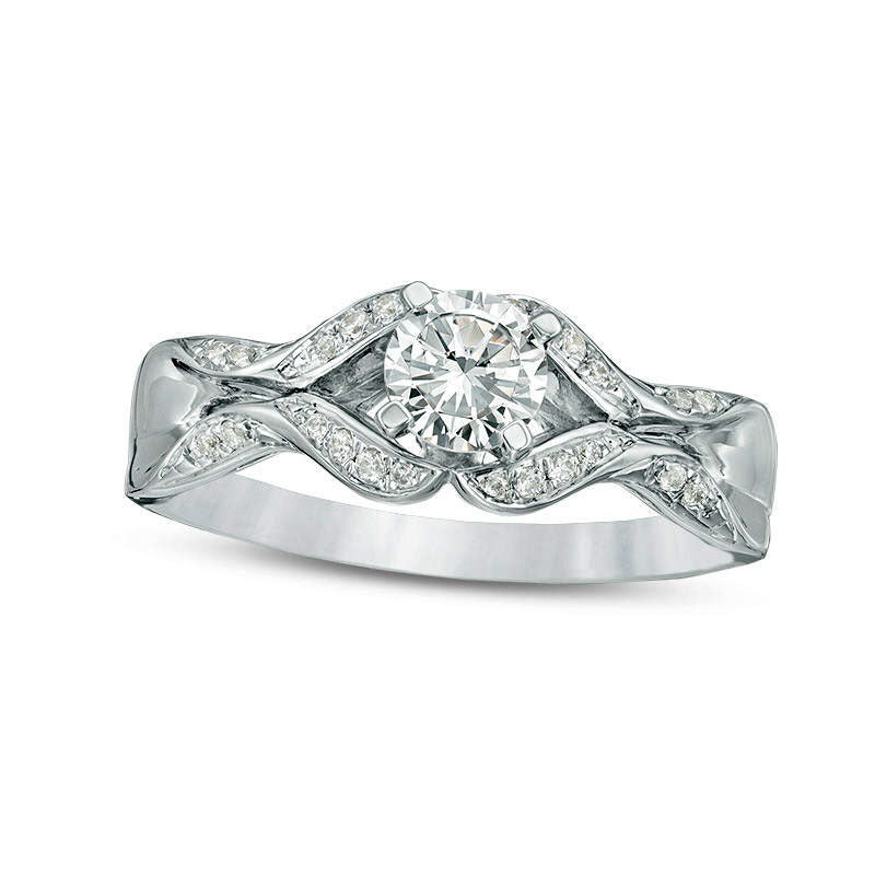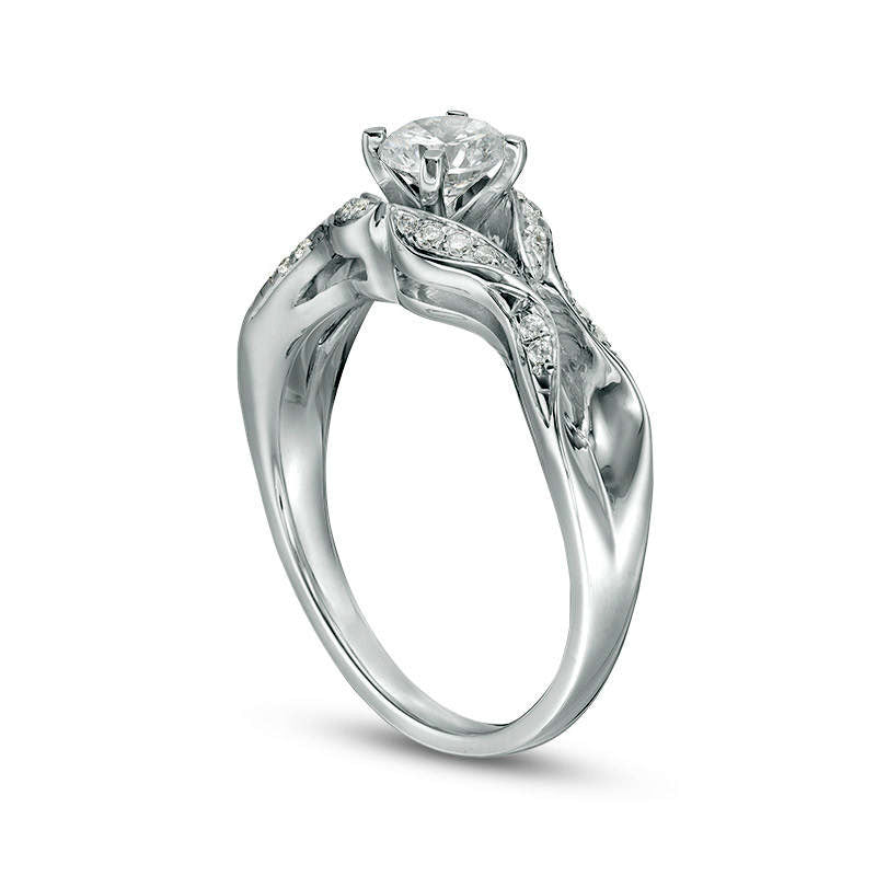 Make her heart skip a beat with this exquisite diamond engagement ring. Crafted in 14K white gold, this contemporary design boasts a breathtaking 1/2 ct. center diamond. The unique split shank showcases intricately sculpted twist ribbons encrusted with dainty diamonds, adding a touch of glamour to the piece. With a combined total weight of 5/8 ct. t.w., this stunning engagement ring will sparkle brilliantly on her finger, a testament to your future together. With its radiant glow and polished finish, this ring captures the essence of your love, leaving her breathless.