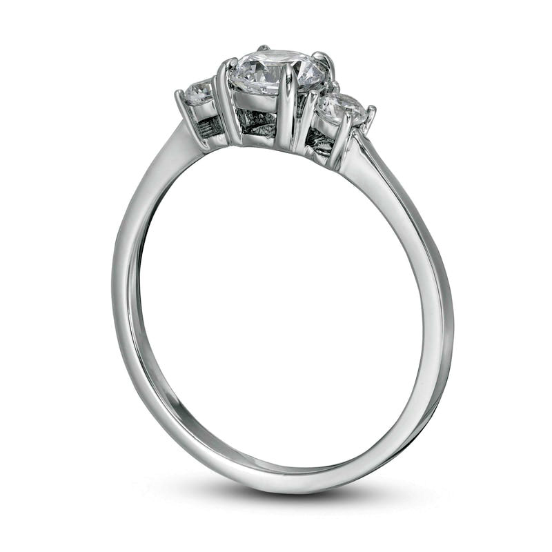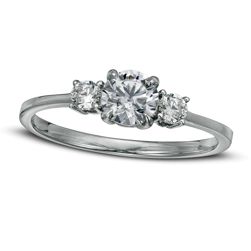 This exquisite diamond engagement ring is a timeless piece that perfectly represents your love story. Made of high-quality 14K white gold, it features a gorgeous three-stone design, with a dazzling 1/2 ct. diamond placed in the center and two 1/15 ct. diamonds on each side. The ring boasts an incredible total diamond weight of 5/8 ct. and has a breathtaking, polished finish. This captivating engagement ring is an ideal match for your partner's individual style and will be cherished for a lifetime.