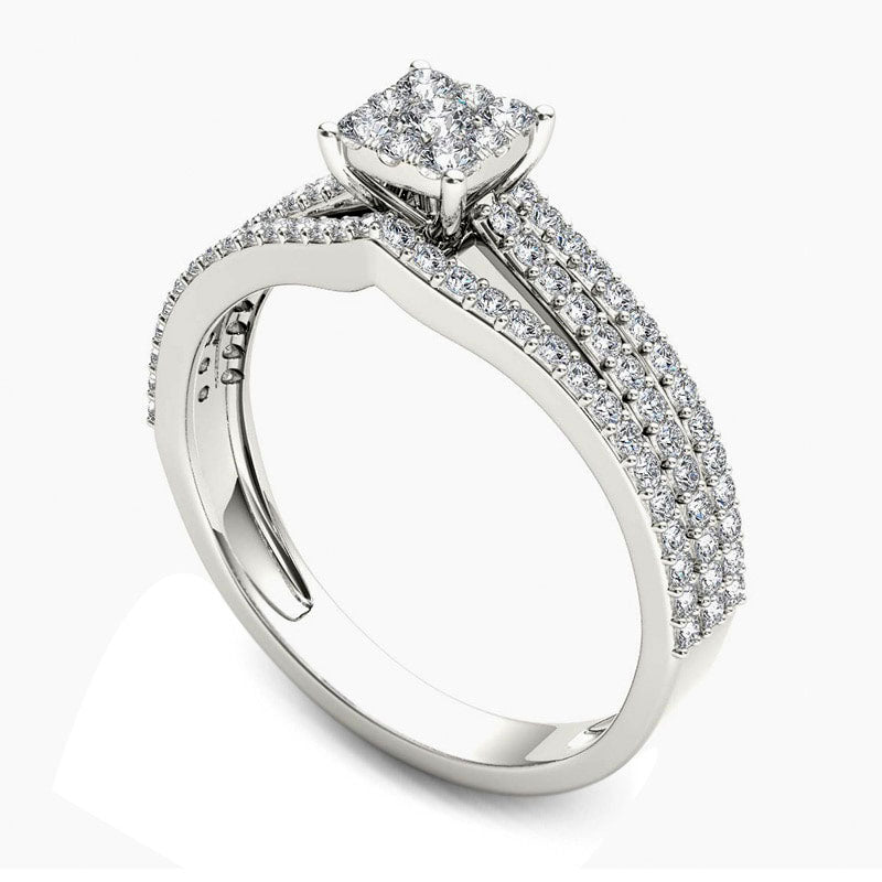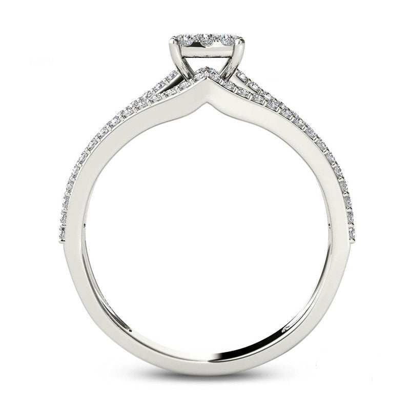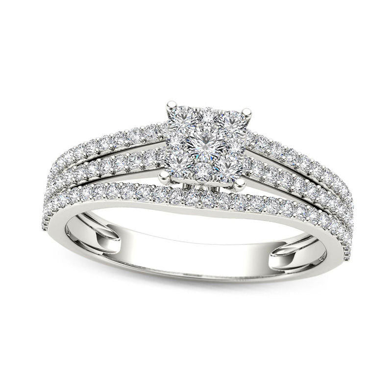 Present your beloved with an exquisite diamond engagement ring that will take her breath away. Made with premium quality 14K white gold, this remarkable ring features an alluring squared diamond composite made with a plethora of perfectly-cut stones, which sits atop a glistening split shank adorned with even more sparkling diamonds. With a total weight of 5/8 ct. t.w., this engrossing piece of jewelry emits unparalleled brilliance and extravagance, promising to win her over in a heartbeat. The ring's impeccable finish gives off a lustrous glow that only adds to its undeniable allure.