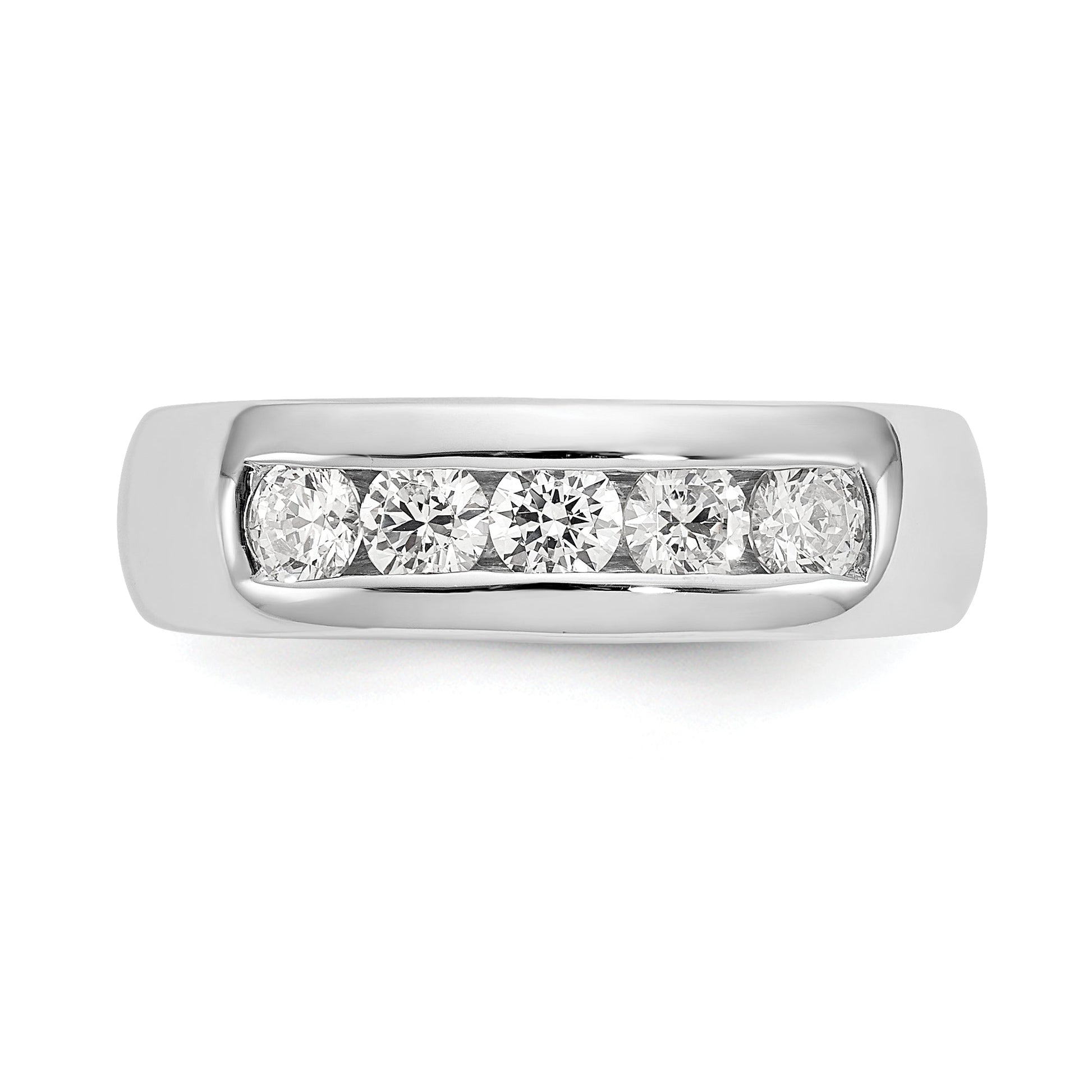 This is a 14K white gold wedding band ring with 5 cubic zirconia stones. The gold is real and will not discolor or oxidize. The cubic zirconia stones are high quality and set by experienced jewelers. This ring can also be upgraded with natural diamonds upon request. It is perfect for special occasions like anniversaries and weddings, or as a everyday wear ring. It comes with a 30-day money-back guarantee and a free gift box. The ring can also be resized.