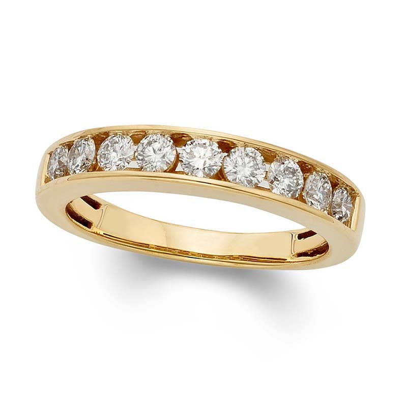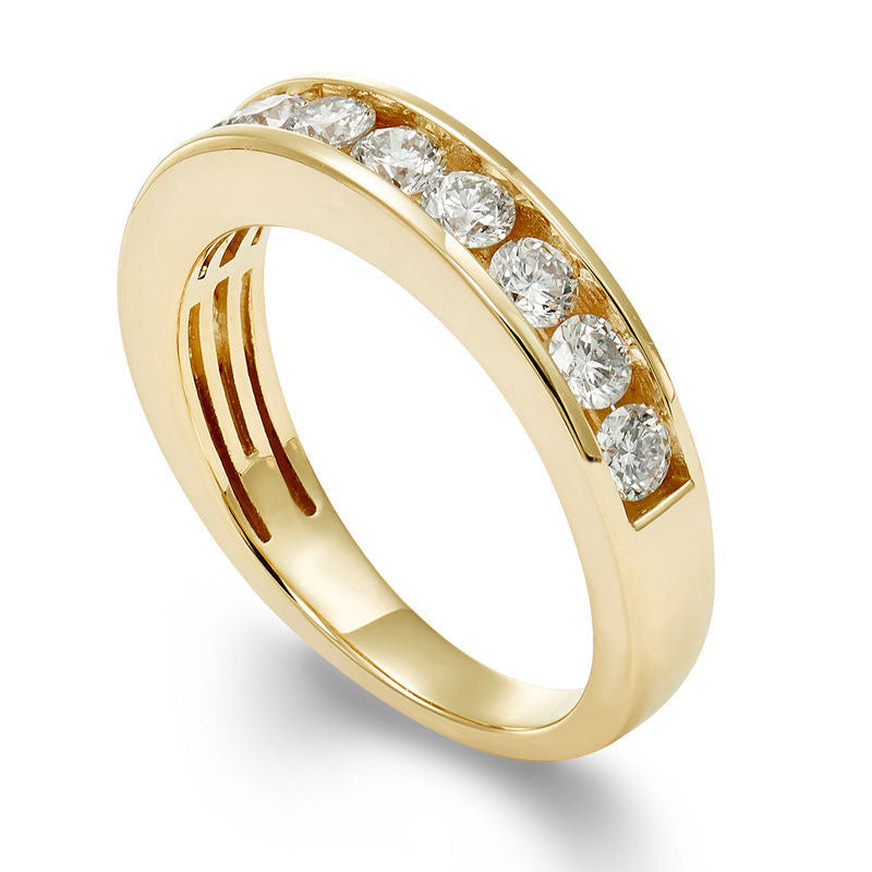 Celebrate your never-ending love with this stunning 3/4 CT. T.W. Certified Diamond Eleven Stone Anniversary Band in 14K Gold (I/I1). Crafted with utmost precision, this timeless band features 11 diamonds beautifully channel-set in an elegant design. Each diamond boasts a color rank of I and clarity of I1, making this band a true symbol of love and commitment. The ring is crafted in 14K gold with a bright polished shine that adds to its beauty. What's more, this stunning piece of jewelry comes with a certificate that guarantees its quality and authenticity, making it perfect for insurance purposes. Give the gift of everlasting love with this glittering anniversary band.