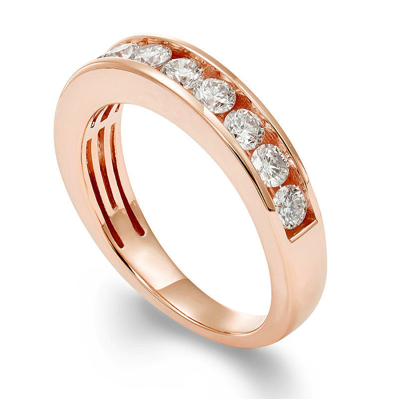 Celebrate your love with this breathtaking certified diamond anniversary band. Made from lustrous 14K rose gold, this exquisite ring features nine stunning stones totaling 3/4 ct. tw., set along the...