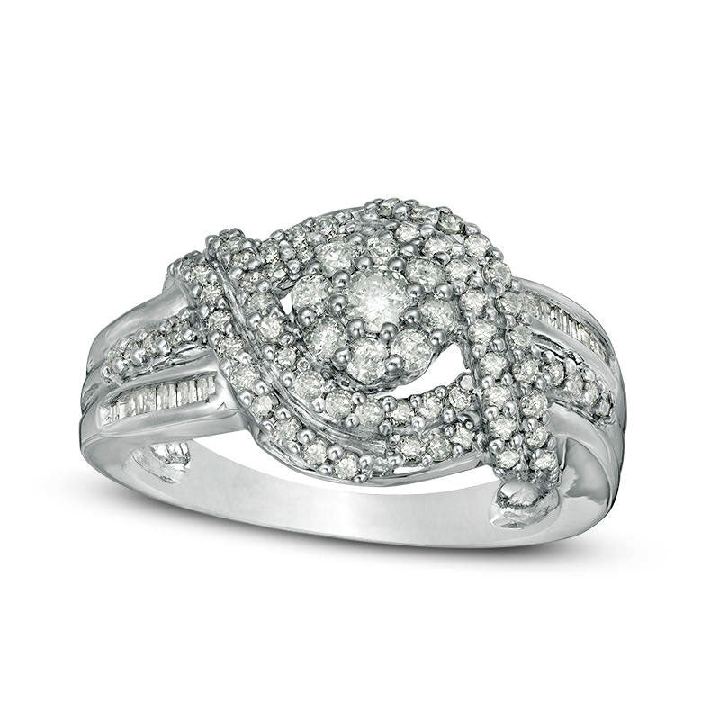 Capture her heart with this captivating diamond engagement ring. Fashioned in stunning sterling silver, this one-of-a-kind ring showcases a gorgeous diamond composite at the center, featuring a dazzling 1/15 ct. stone. The center is framed by two intertwined ribbons of round diamonds that cross over the round and baguette-cut diamond-laden band. Boasting an impressive 3/4 ct. t.w. of diamonds and a brilliant polished finish, this exquisite piece is sure to bring an abundance of sparkle to her eyes. Make it unique for her by having it custom-made to fit her finger size. Please note that sterling silver rings are not resizable after purchase.
