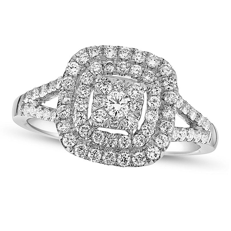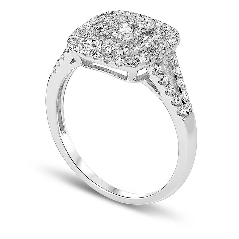 This exquisite diamond engagement ring will leave her speechless on the day that you propose. Made from top-quality 14K white gold, the ring features a square-shaped centerpiece adorned with a dazzling composite of round diamonds. Surrounding the center cluster is a double border of smaller, yet equally brilliant, round accent diamonds. The split shank of the ring is also embellished with additional accent diamonds, providing exceptional sparkle from every angle. With a grand total of 3/4 ct. t.w. of diamonds, this ring emanates a polished shine that will take her breath away.