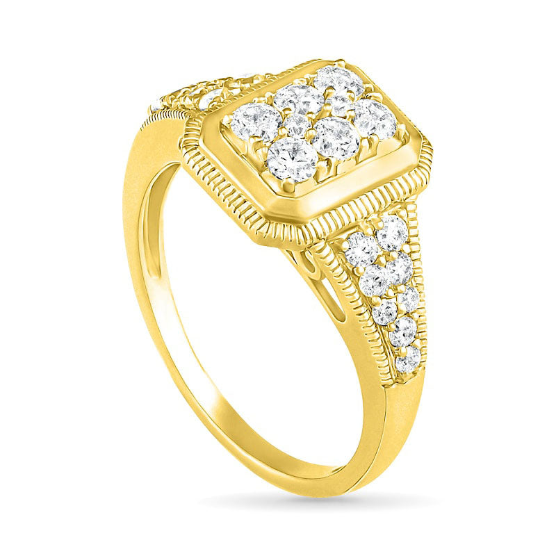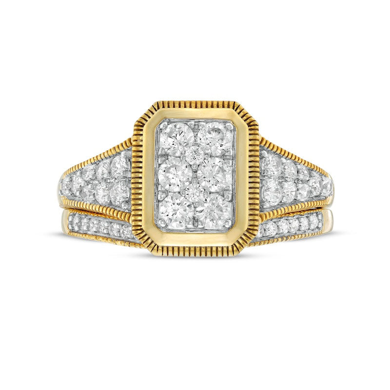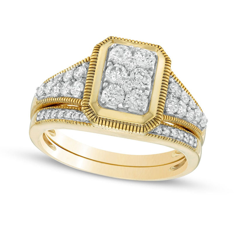 Make a timeless statement of your love with this vintage-inspired diamond bridal set. The engagement ring is beautifully crafted in lustrous 10K gold and features a rectangular composite of diamonds that adds a touch of glamour. Milgrain-detailed borders wrap around the diamonds, adding a polished and intricate design. The shank of the ring has rows of diamonds that shine bright, nestled between ribbons of milgrain. The contoured wedding band is crafted with the same attention to detail, adorned with diamonds and milgrain detailing. With a total weight of 3/4 ct. T.W. of diamonds, this bridal set exudes heirloom appeal and radiates with a timeless elegance that shines brilliantly with every special moment. Enjoy the brilliance and sparkle that this set will bring to your life, a symbol of your unending love.