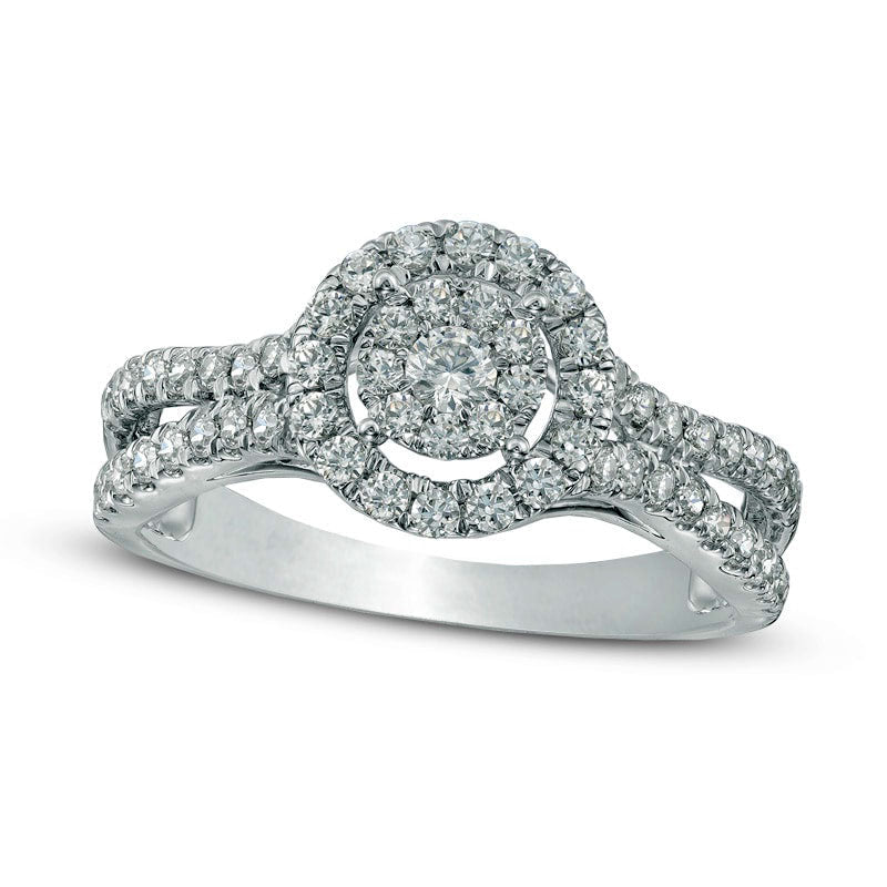 Experience the mesmerizing beauty of this stunning diamond engagement ring that will capture her heart. With a simple elegance, this 10K white gold ring flaunts a dazzling diamond center in composite style that is complemented by a chic diamond-lined halo frame. The ring's shank is adorned with a double row of accent diamonds, elevating its brilliance and offering a complete look. This comfort-fit ring features 3/4 ct. t.w. of diamonds that shine radiantly in the light, exuding a classic and timeless charm. Let her cherish this remarkable piece that boasts a polished gleam, forever reminding her of your love.