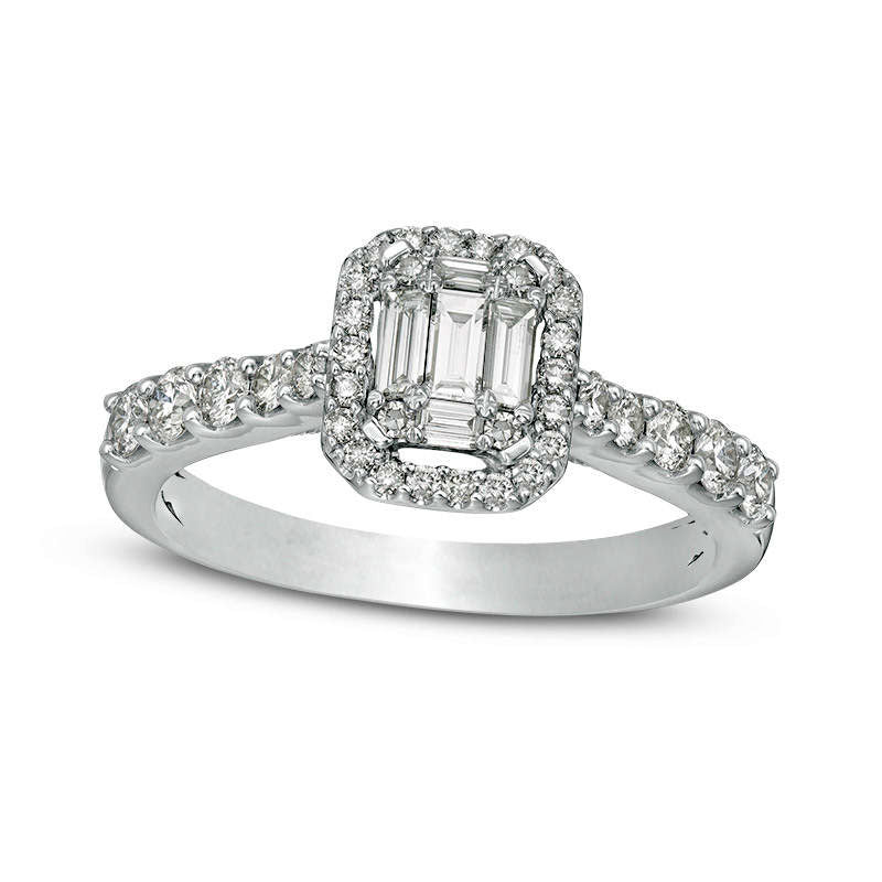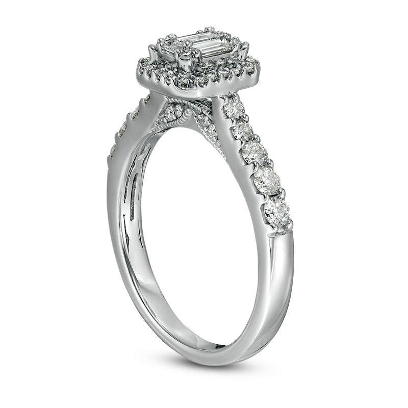 Introducing a stunning vintage-style diamond engagement ring that beautifully represents the sophisticated fashion sense of your special someone. Crafted with precision in 14K white gold, this engagement ring features a breathtaking octagon-shaped halo frame that includes 1/20 ct. baguette-cut and round diamonds which accentuate its timeless design. The intricately milgrain-detailed and beautifully pinched shank is delicately encrusted with varying sizes of round diamonds. This exceptional ring radiates with 3/4 ct. t.w. composite diamonds that give it an unparalleled shine and brilliant dazzling effect. Treasure a lifetime of memories with this enticing engagement ring that shines brightly with a dazzling buffed finish.