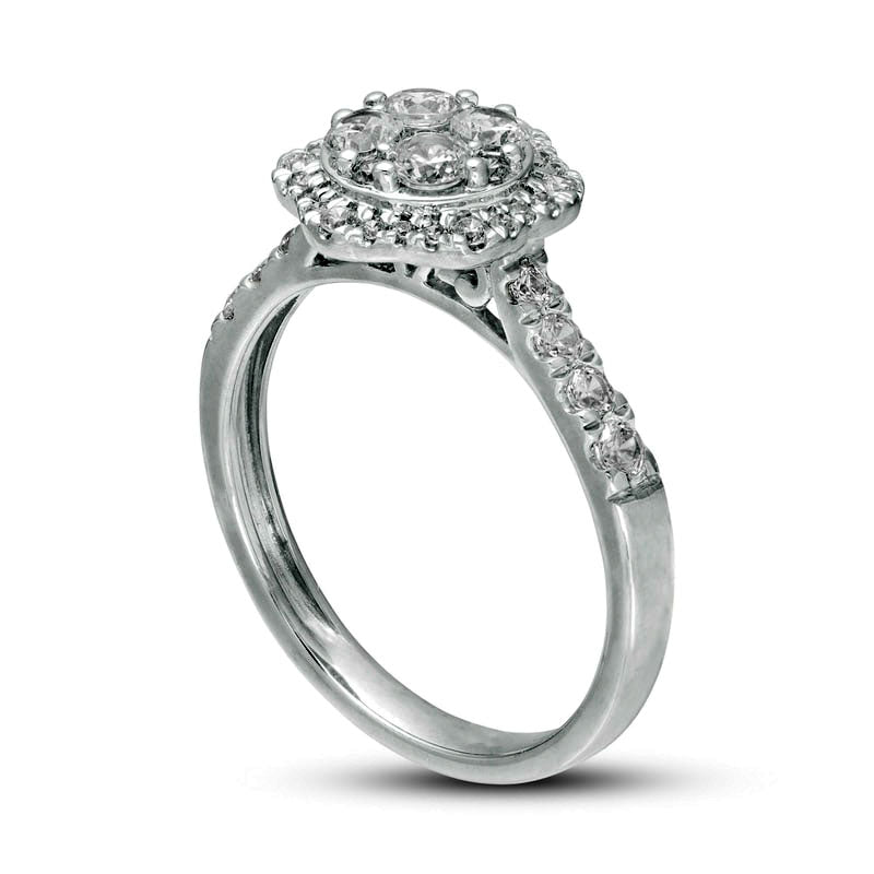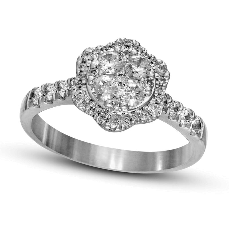 The perfect symbol of your eternal love, this stunning engagement ring is adorned with charming details. Beautifully crafted from 10K white gold, the ring features a diamond composite showcasing four glittering 1/15 ct. diamonds, elegantly surrounded by a scalloped diamond-lined frame. The shank is also adorned with diamonds, creating a breathtaking overall effect. Boasting a total weight of 3/4 ct. t.w. and a brilliant shine, this engagement ring is sure to capture your beloved’s heart.