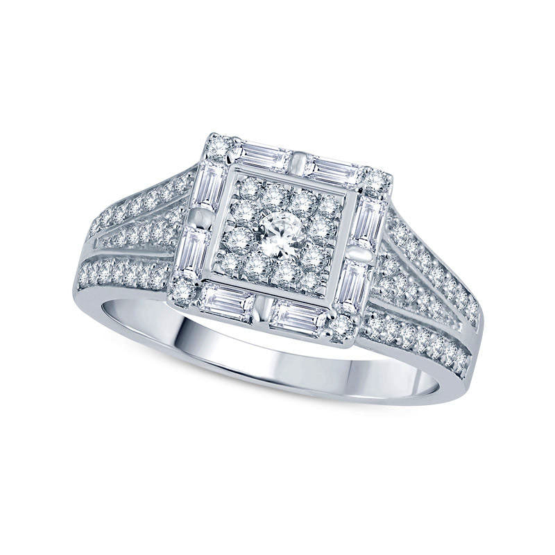Propose with a ring she will always cherish, like this stunning diamond engagement ring. Made with gleaming 14K white gold, this ring boasts a beautiful square composite of sparkling diamonds at the centre, surrounded by a border of square and round baguette-cut diamonds. The shank of the ring is also lined with rows of diamonds, completing the dazzling effect. Boasting 3/4 ct. t.w of diamonds and a stunning buffed lustre, this ring reflects her bold style and is sure to make the moment unforgettable.