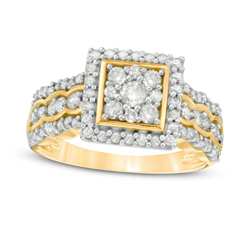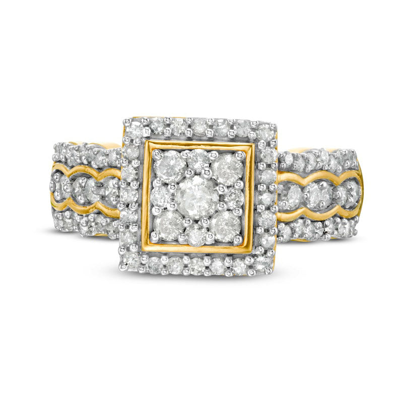 This striking engagement ring will appeal to any woman with its delicate touches and stunning sparkle. Crafted from lustrous 10K gold, the ring features a square composite of diamonds with a central 1/15 ct. diamond that shimmers brightly. Around the composite, a polished border and diamond-encrusted frame create an eye-catching focal point. The triple-row shank showcases scalloped polished borders and diamonds, elevating this piece to a new level of sophistication. With a total of 3/4 ct. t.w. of diamonds and a brilliant finish, this engagement ring is the perfect choice for your beloved.