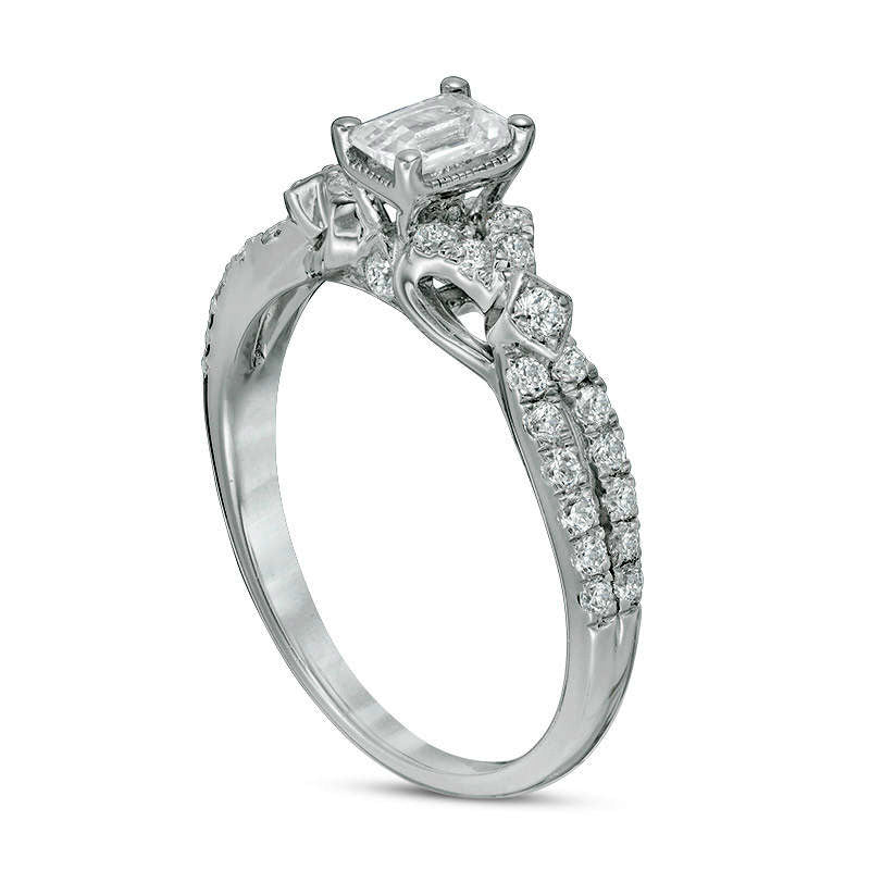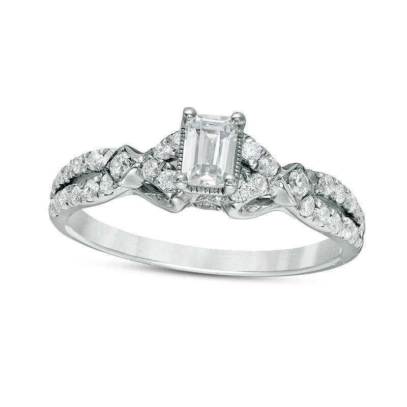 Declare your everlasting love with the dazzling vintage-inspired diamond engagement ring. Constructed of high-quality 14K white gold, this charming piece showcases a sparkling 1/3 ct. emerald-cut diamond placed in a carefully crafted milgrain-detailed frame. The beautifully designed split shank with its delicate, diamond-studded curves and stations adds an antique touch. Additionally, two diamonds are placed under the centerpiece to ensure gleam from all angles. This engagement ring boasts an impressive 3/4 ct. t.w. of diamonds and a magnificent buffed luster, making it an ideal choice for starting a lifetime of love. This ring is exclusively obtainable in size 7.