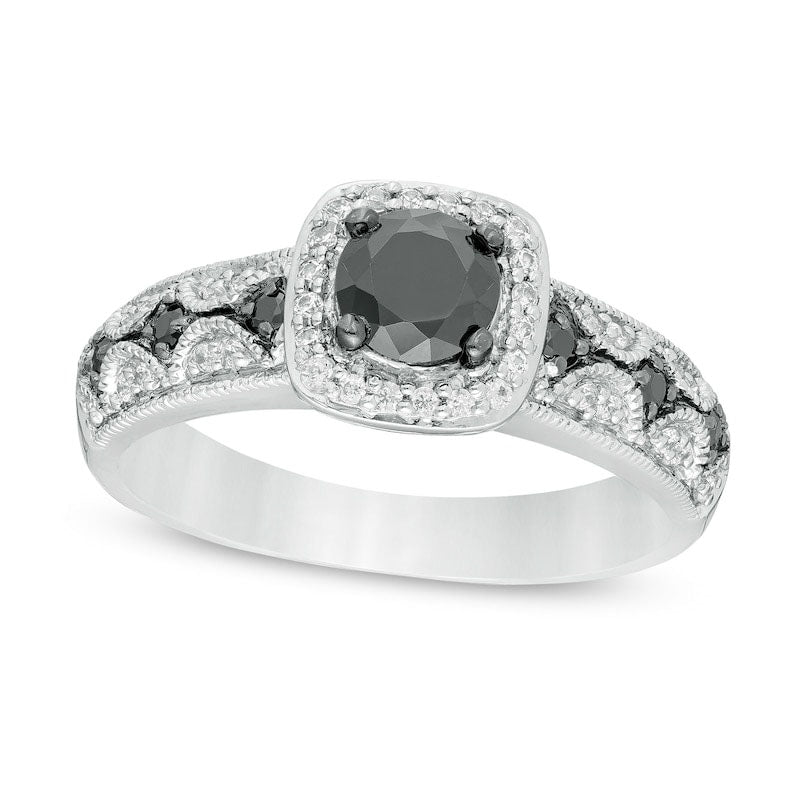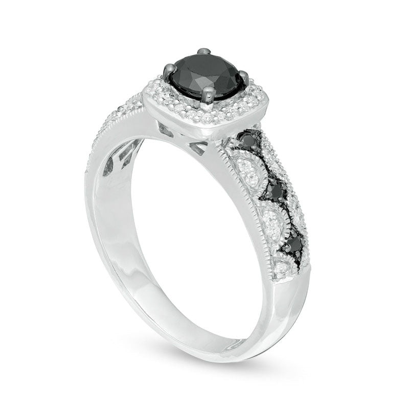 0.75 CT. T.W. Enhanced Black and White Natural Diamond Cushion Frame Antique Vintage-Style Engagement Ring in Solid 10K White Gold