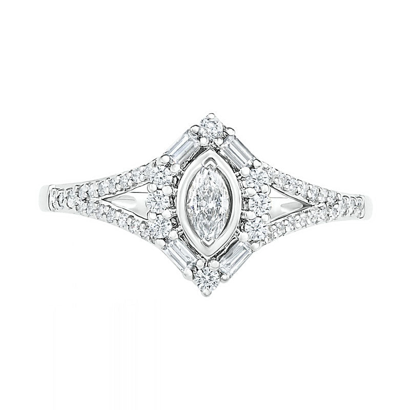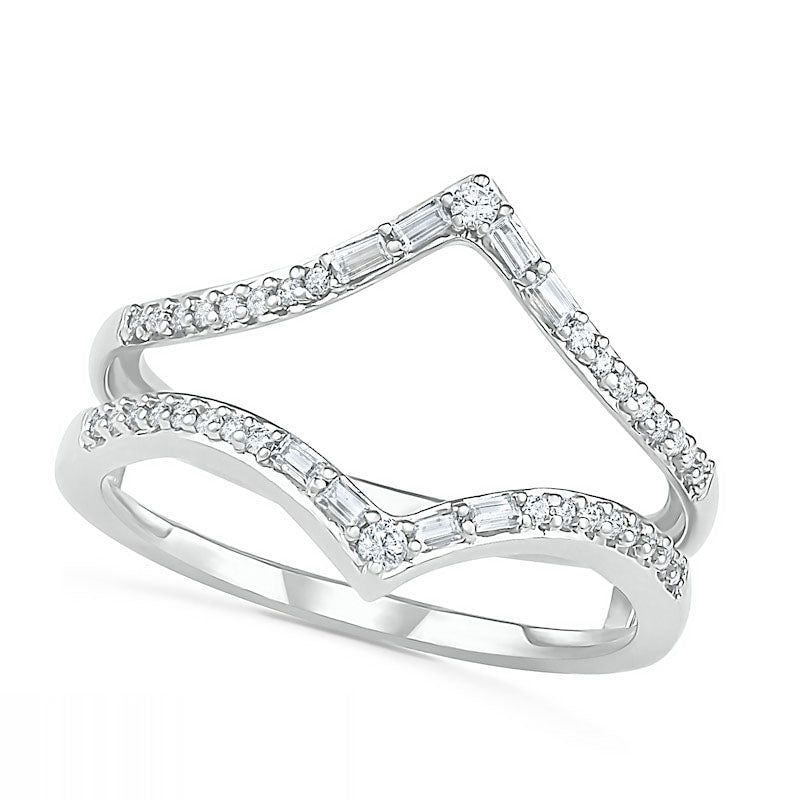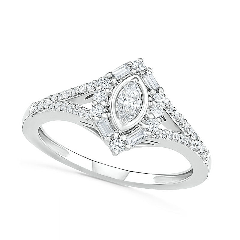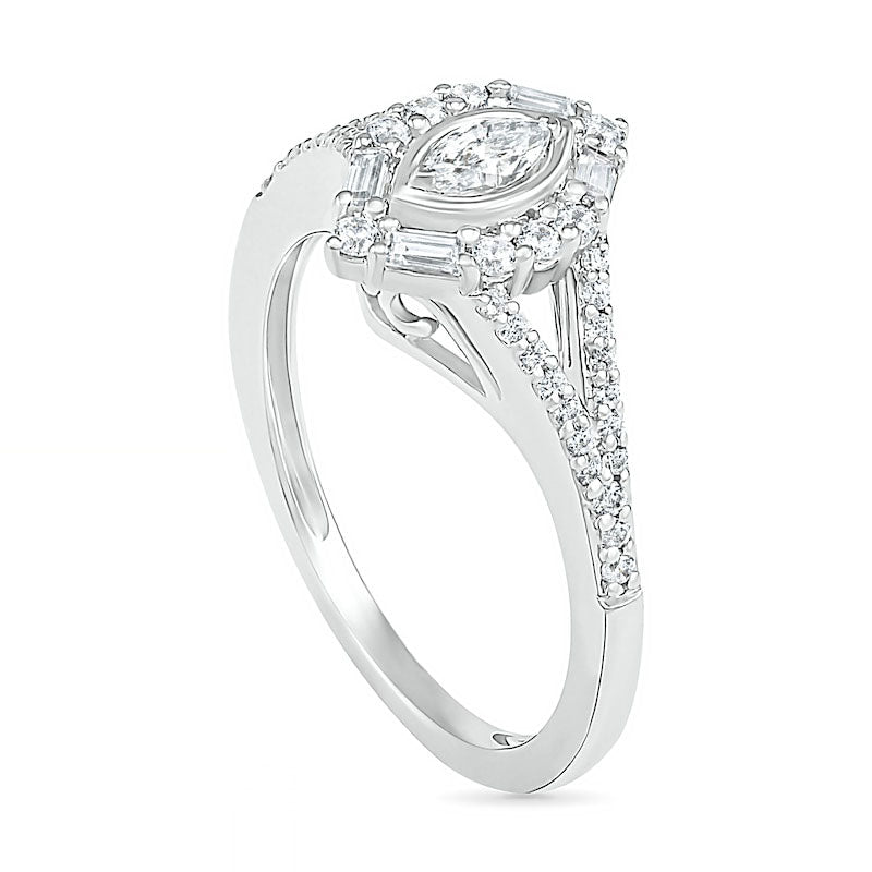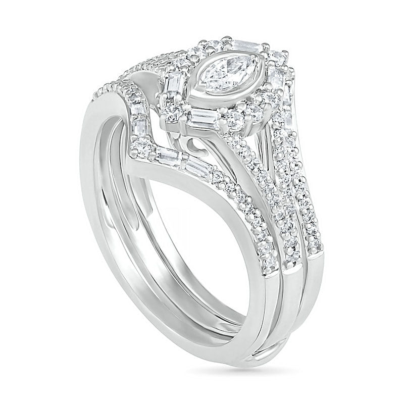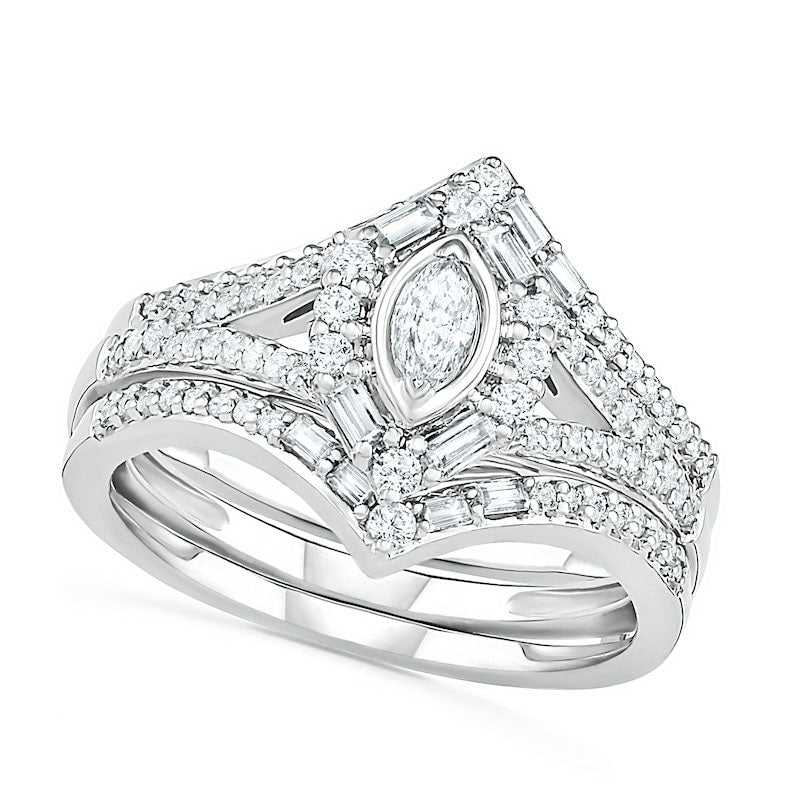 This exquisite diamond bridal set is the ultimate symbol of your commitment to your beloved. Expertly crafted in luxurious 10K white gold, the engagement ring features a captivating 1/4 ct. marquise-cut diamond that glimmers within a halo of dazzling round and baguette-cut diamonds. The split shank is expertly adorned with sparkling diamonds, adding even more radiance to this already stunning piece. The double-row enhancer boasts ribbons in a chic chevron shape, adorned with round and baguette-cut diamonds. Collectively, these dazzling stones weigh in at an impressive 3/4 ct. t.w. This bridal set is a breathtaking display of your love, sure to elicit fond memories and cherished moments for generations to come.