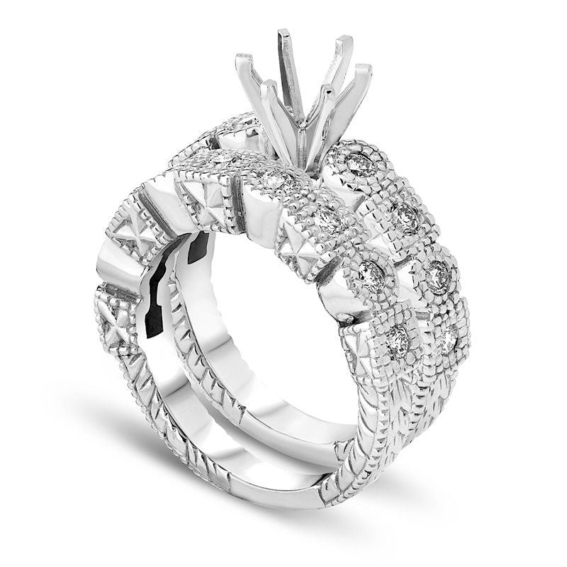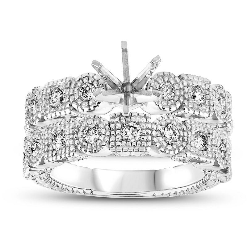 Transform her wedding dreams into reality with this distinct diamond semi-mount bridal set. Crafted from 14K white gold, the engagement ring showcases a classic four-prong setting tailored to flaunt your splendid 3/4 round diamond. The shank of the ring is accentuated by alternating round and squared frames studded with sparkling round diamonds. A matching diamond wedding band complements the set perfectly. This breathtaking Art Deco-inspired semi-mount bridal set glows with 3/4 ct. t.w. of diamonds, and is brilliantly polished for a stunning finish.