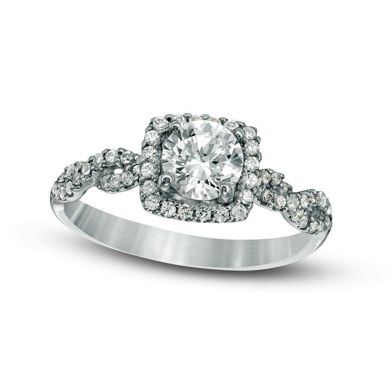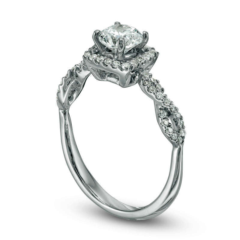 This captivating diamond engagement ring is the perfect way to profess your love to your bride-to-be. The ring is delicately crafted from exquisite 10K white gold and showcases a magnificent 1/2 ct. center stone surrounded by a stunning cushion-shaped halo frame of glittering diamonds. The graceful twisting split shank is also adorned with petite diamonds that add an extra sparkle to this already luminous ring. With a total weight of 3/4 ct. t.w. of diamonds, this engagement ring exudes sheer brilliance and radiance that is sure to charm your loved one. Wear it with pride and bask in the bright polished shine that it radiant.