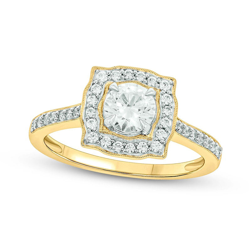 This stunning engagement ring exudes timeless elegance and a vintage charm that will captivate her heart. Meticulously crafted in luxurious 14K gold, it showcases a sparkling 1/2 ct. diamond cradled in a beautiful cushion-shaped diamond frame accentuated with delicate milgrain detailing. The shank is adorned with a glittering array of diamonds, completing the allure of this engagement ring. Totaling 3/4 ct. t.w. of pure brilliance and radiating with a polished finish, this ring is the perfect symbol of your undying love and commitment. Let it be the start of your happily ever after story.