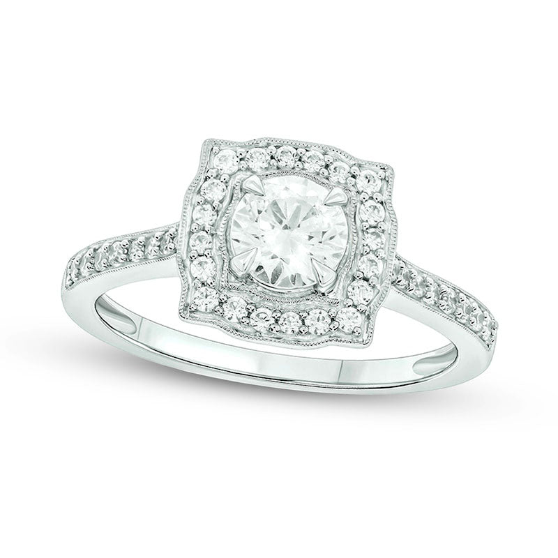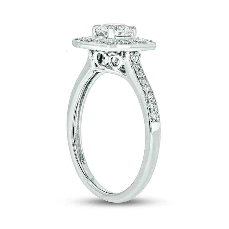 Celebrate your love with utmost elegance and sophistication by presenting this vintage-style diamond engagement ring to your beloved. Crafted from 14K white gold, this exquisite ring features a stunning 1/2 ct. diamond that is enveloped in diamonds set in a cushion-shaped frame, adorned with intricate milgrain detailing. The shank is also embellished with diamonds, adding to its allure. With a total weight of 3/4 ct. t.w. of diamonds, this engagement ring exudes a bright and polished shine, setting the perfect stage for your happily ever after. Give your partner a gift that she will cherish forever.