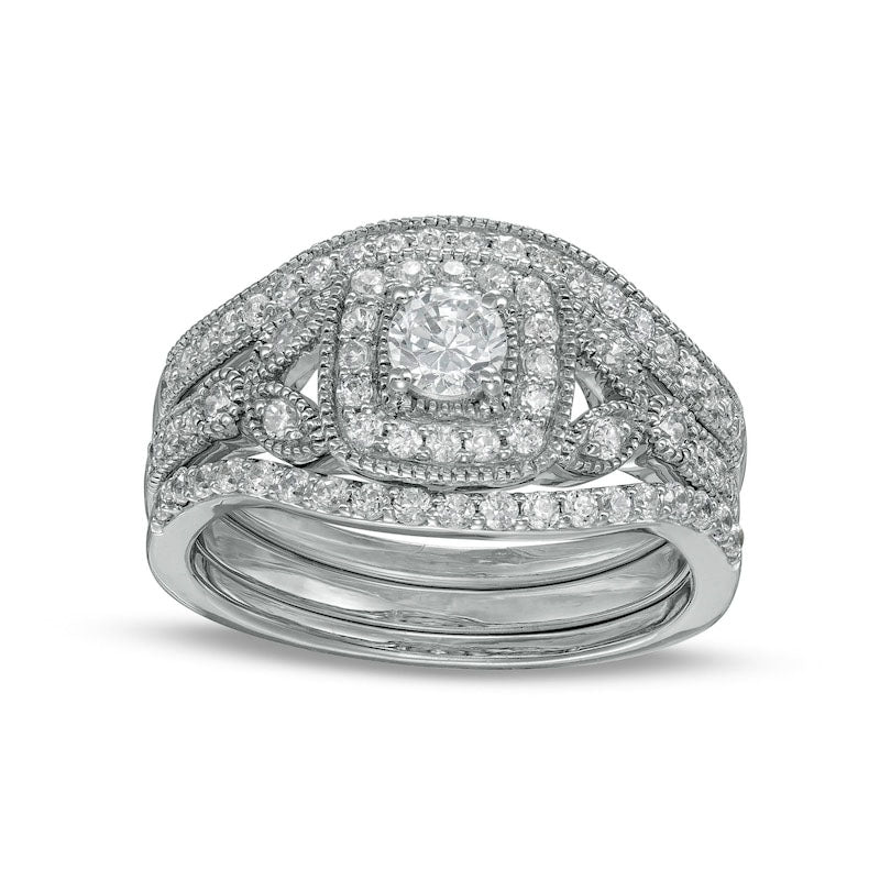 0.75 CT. T.W. Natural Diamond Cushion-Shaped Frame Antique Vintage-Style Three Piece Bridal Engagement Ring Set in Solid 10K White Gold (J/I3)