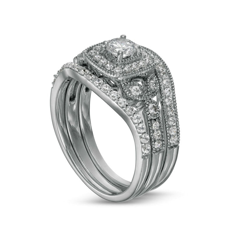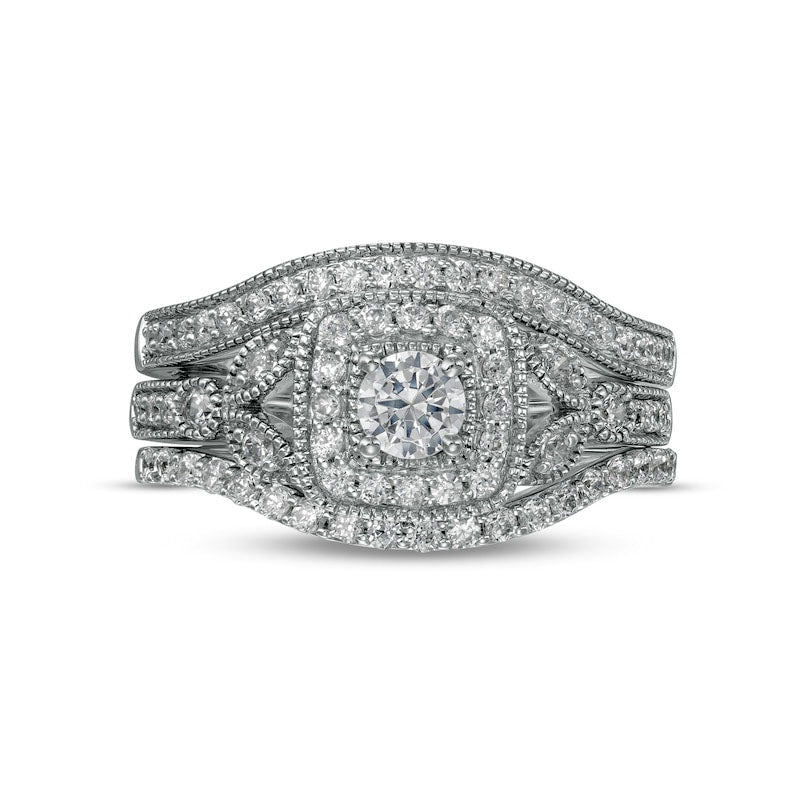 Experience an unforgettable vintage-inspired look with this stunning 3/4 CT. T.W. Diamond Cushion-Shaped Frame Vintage-Style Three Piece Bridal Set in 10K White Gold (J/I3). This set is simply mesmerizing with...