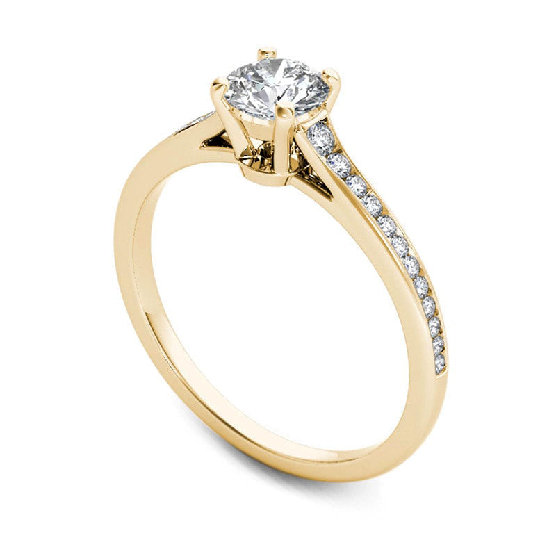This stunning engagement ring features a sparkling 5/8 carat round diamond at its center, set in warm 14K gold. The band is embellished with smaller round diamonds, adding extra beauty and elegance to the classic design. With a total diamond weight of 3/4 carat, this ring is sure to take her breath away. It has a polished shine, making it a truly breathtaking piece of jewelry that she'll cherish forever.