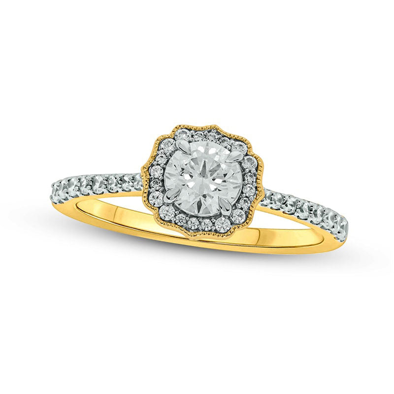 This enchanting engagement ring exudes timeless elegance and romantic allure. Made from luxurious 14K gold, it showcases a dazzling 1/2 ct. diamond at the center, surrounded by a lustrous floral frame adorned with multi-sized diamonds and intricate milgrain detailing. The slightly tapered shank adds further charm to this vintage-style piece. Boasting a total diamond weight of 3/4 ct. and a polished finish, this engagement ring is a stunning declaration of everlasting love.