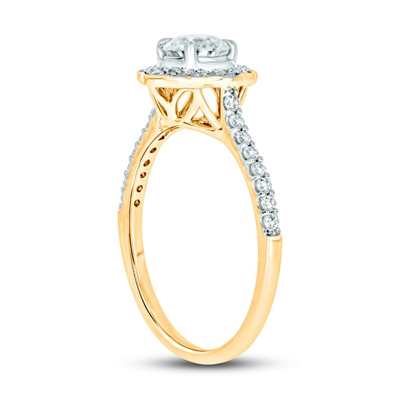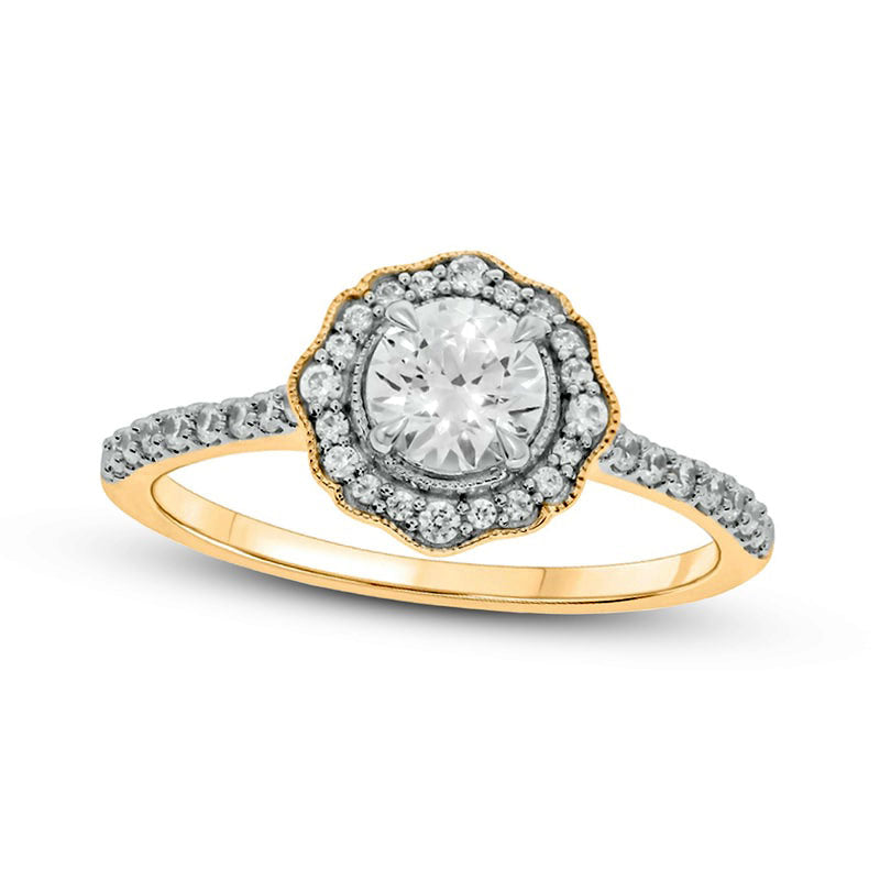 This stunning engagement ring is the perfect symbol of your love. Crafted from 14K gold, it boasts a vintage-inspired design that will surely impress. The centerpiece of this exquisite piece is a gorgeous 1/2 ct. diamond that glistens brilliantly in a meticulously detailed frame adorned with diamond-lined petal shapes. The shank is also beautifully embellished with sparkling diamonds, adding to the ring's captivating allure. With a total diamond weight of 3/4 ct. and a polished finish, this engagement ring is a true treasure that will be cherished for a lifetime.