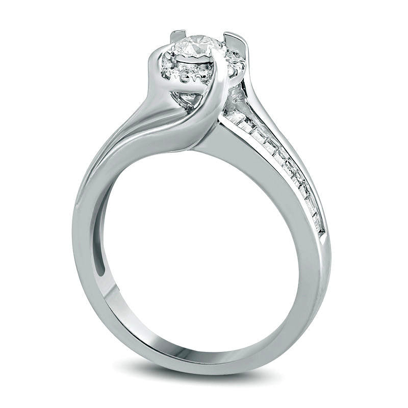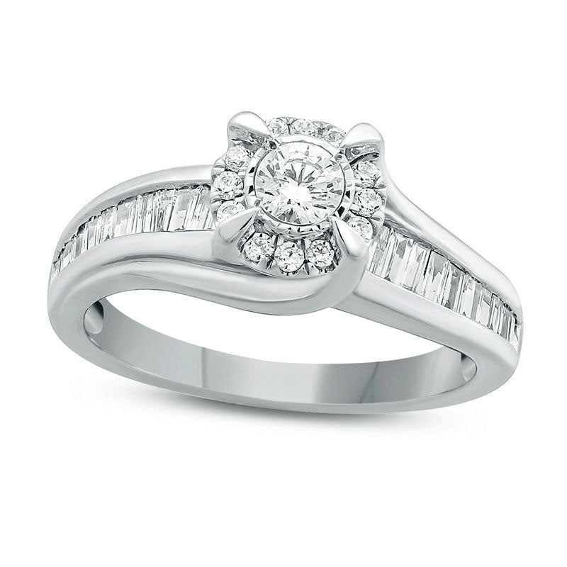 Experience the epitome of romance and companionship with this exceptional 3/4 CT. T.W. Diamond Frame Bypass Engagement Ring in 10K White Gold. Exquisitely crafted to symbolize your eternal bond, this dazzling diamond engagement ring is designed to captivate your partner's heart. The sleek and elegant 10K white gold band is encrusted with a radiant 1/5 ct. diamond, accentuated by a radiant frame of meticulously crafted diamonds that enhance its sparkle and size. The curved-end bypassing shank features channel-set baguette-cut diamonds that create a breathtaking display. This magnificent ring showcases a total of 3/4 ct. t.w. of diamonds and exudes an exquisite brilliance that is sure to impress. With a brilliant buffed luster, this engagement ring is the perfect symbol of your enduring love and commitment, representing the start of a remarkable journey together.