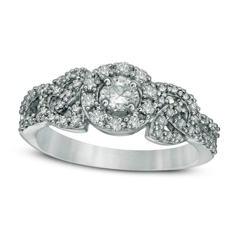 Presenting a breathtaking Celtic-inspired engagement ring, guaranteed to leave her spellbound. Carefully crafted in lustrous 10K white gold, this ring features a dazzling 1/5 ct. diamond center stone that's encircled by smaller diamonds in a mesmerizing frame. With diamond-lined knot designs adorning the sides and a diamond-studded split shank, this ring exudes unmatched elegance and style. The ring sparkles brightly with a total diamond weight of 3/4 ct. and is sure to win her heart. Displaying a brilliant polished finish, this engagement ring will undoubtedly become her prized possession.