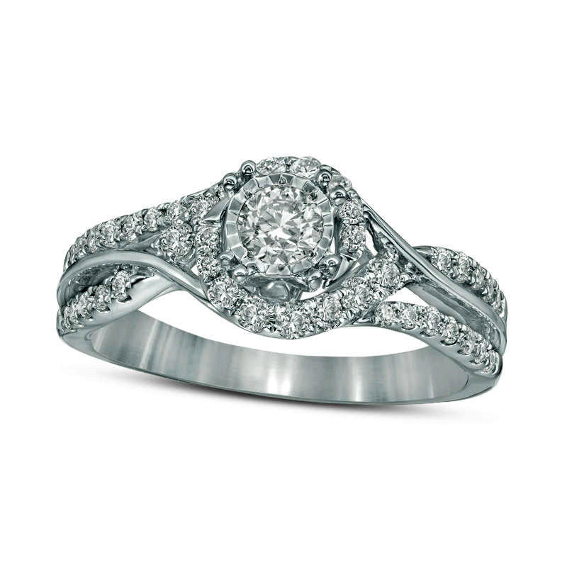 If you're looking for a dazzling and contemporary diamond engagement ring for your discerning bride, look no further than this stunning piece. Made from cool 14K white gold, its captivating design showcases a 1/4 ct. diamond center stone which has been expertly set to enhance its size and sparkle. Surrounding the central gemstone are glistening diamond-lined and polished ribbons which beautifully swirl around it in a lovely bypass style. The split shank of the ring is also encrusted with an array of diamonds, making this piece radiant with 3/4 ct. t.w. of diamonds that are sure to take her breath away. With a bright, polished shine, this alluring engagement ring is sure to make the moment truly magical.