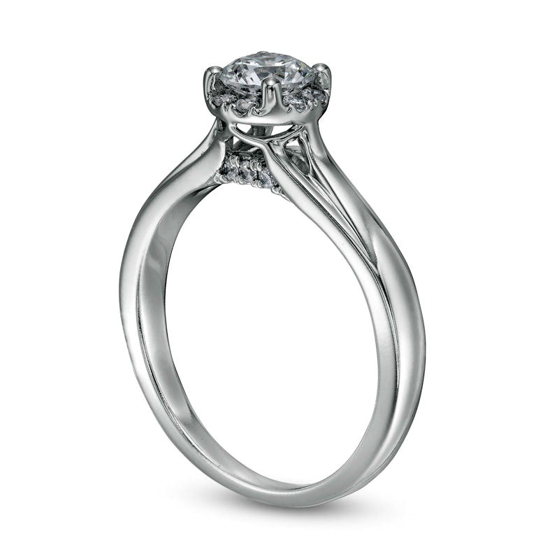 This lovely diamond engagement ring is a subtle yet stunning choice for your proposal. It is expertly crafted in 14K white gold, and features a 5/8 ct. diamond nestled within a dazzling diamond halo. The shank has a unique sculpted design with a raised center ribbon, and surprise diamonds along the gallery. The smooth, rounded inside of the shank ensures all-day comfort. With a total weight of 3/4 ct. t.w. of diamonds and a bright polished finish, this engagement ring is a timeless and beloved choice for your beloved.
