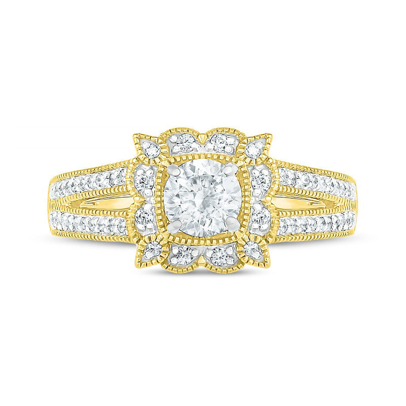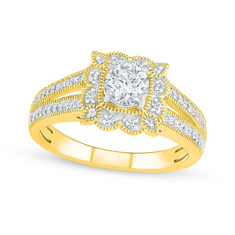 Say "I do" to the timeless beauty of this vintage-inspired diamond engagement ring. Crafted from lustrous 10K gold, the ring boasts a stunning 1/2 ct. diamond, dazzling within an intricate milgrain border. Petal-like frames, adorned with smaller diamonds and delicate milgrain accents, encircle the centerpiece in a scalloped square shape. The split shank shimmers with two rows of diamonds, each wrapped in a milgrain border. Radiant with 3/4 ct. t.w. of diamonds and a brilliant and polished shine, this engagement ring is a perfect embodiment of your love and commitment.