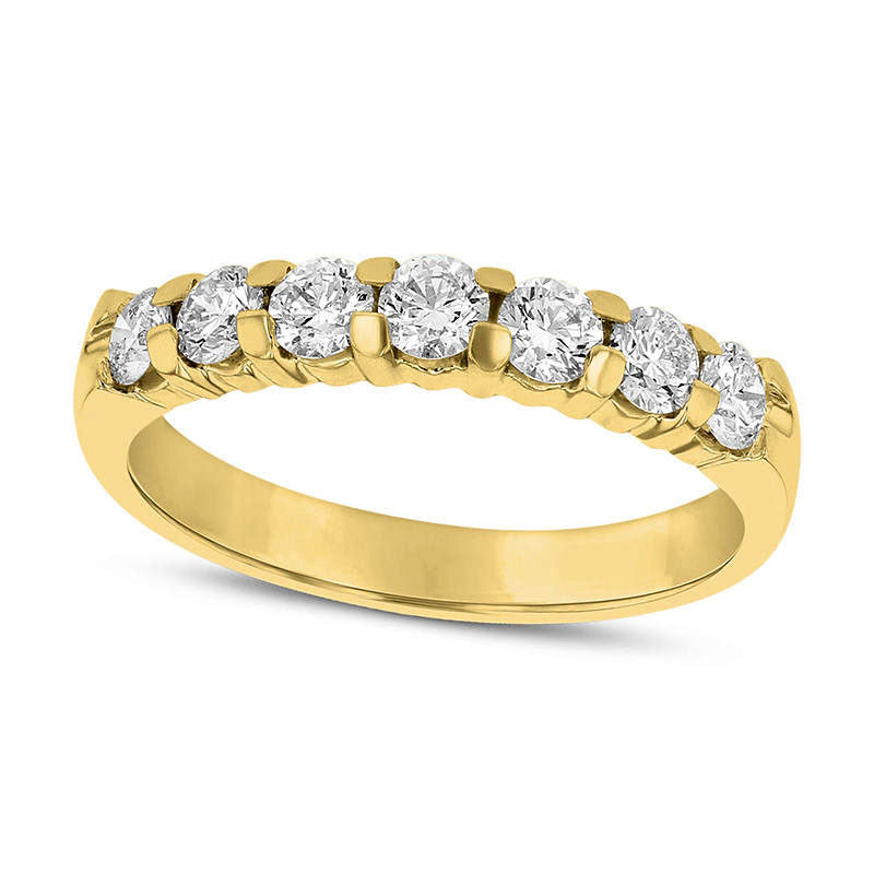 Commend the endurance of your bond with the stunning Diamond Seven Stone Anniversary Band. Carved from 14K gold, this masterpiece boasts a ravishing design created by a series of exquisite 1/10 ct. diamonds. The seven-stone anniversary band is bedazzled to perfection with a sumptuous 1/2 ct. t.w. of diamonds and features a remarkable buffed luster, making it a symbol of your unwavering love. This anniversary band is sure to express the profound depth of your affection.