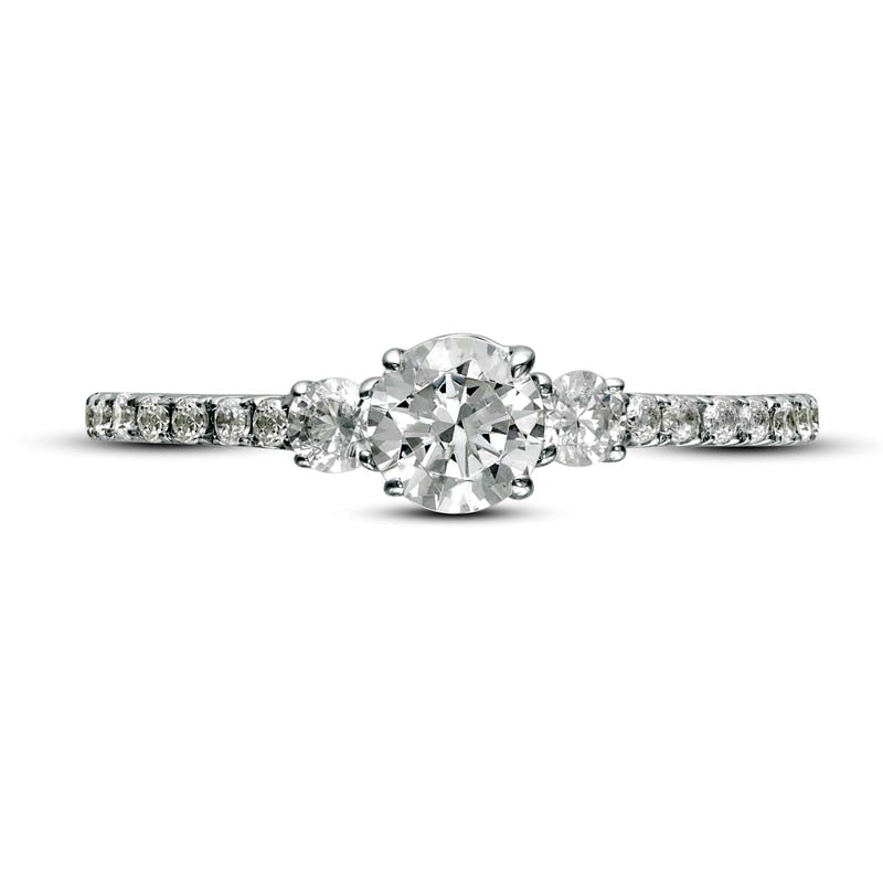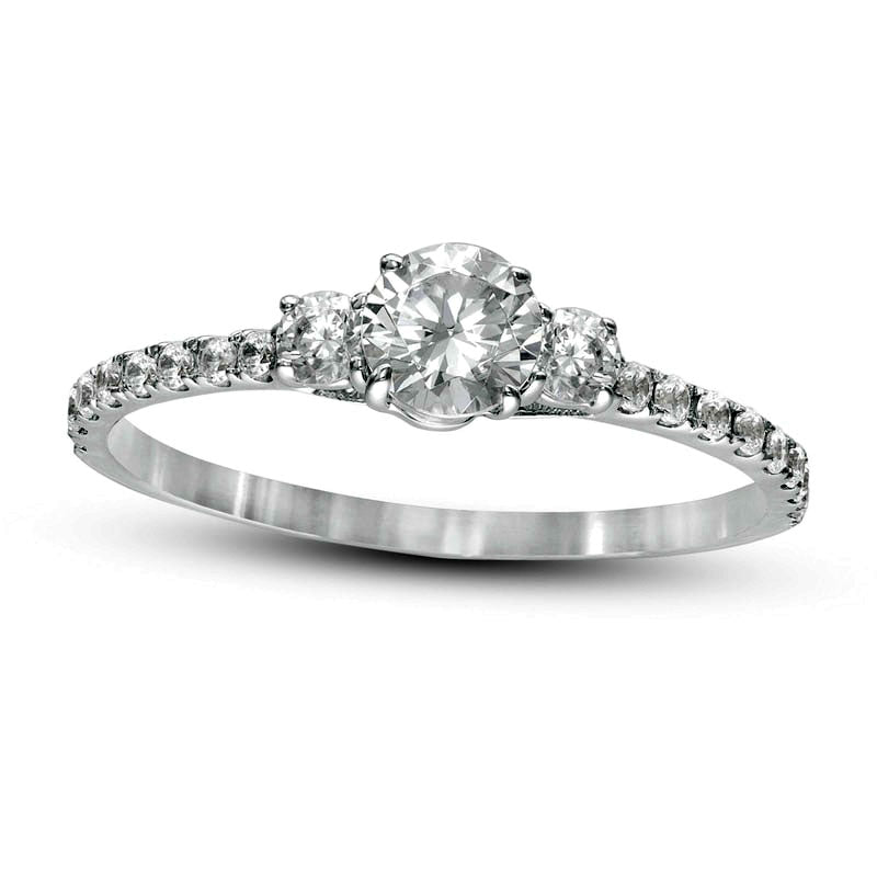 Capture her heart forever with the everlasting elegance of this diamond engagement ring. Crafted in 14K white gold, the ring flaunts a three-stone design showcasing a gorgeous 3/8 ct. diamond at the center, flanked by 1/15 ct. diamonds on either side. The slender shank of the ring is also adorned with sparkling diamonds to add more opulence to the piece. With a total of 3/4 ct. t.w. of diamonds and a remarkable shine, this engagement ring is the embodiment of everlasting love and enduring beauty. Make it hers and cherish your love story forever.