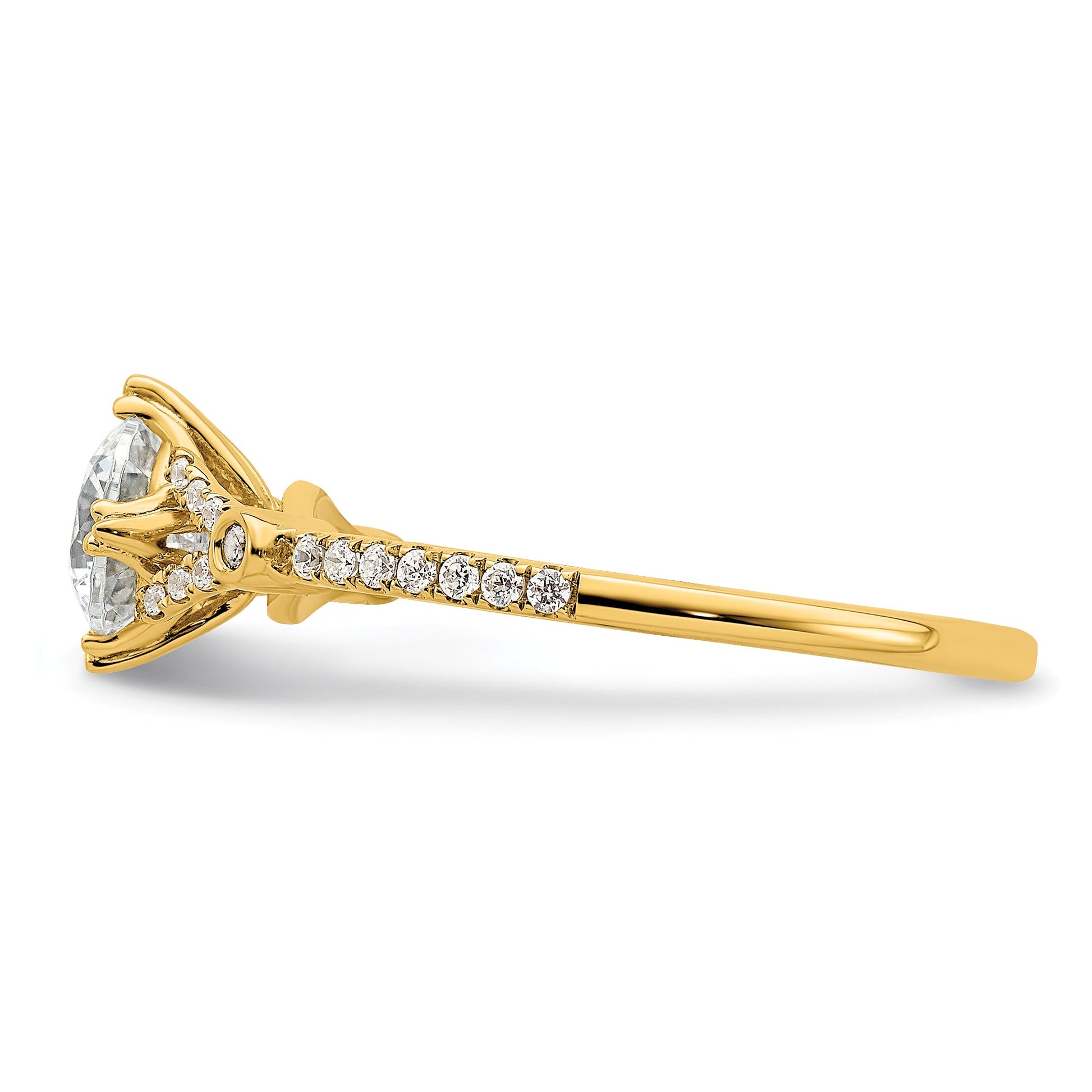 Additional details of this beautiful ring include a polished finish, a solid gold setting, and 8 prongs securing the center stone. The band measures 1.3mm in width and has a thickness of less than 1mm. The head height of the ring is 6.4mm, making it stand out on the finger. It features a total of 28 stones, including the center stone mounting, 2 round bezel-set CZ side stones measuring 1.7mm each, and 26 round, prong-set CZ accent stones measuring 1mm each. This ring is sizeable and designed to fit any finger. Available to be shipped worldwide.