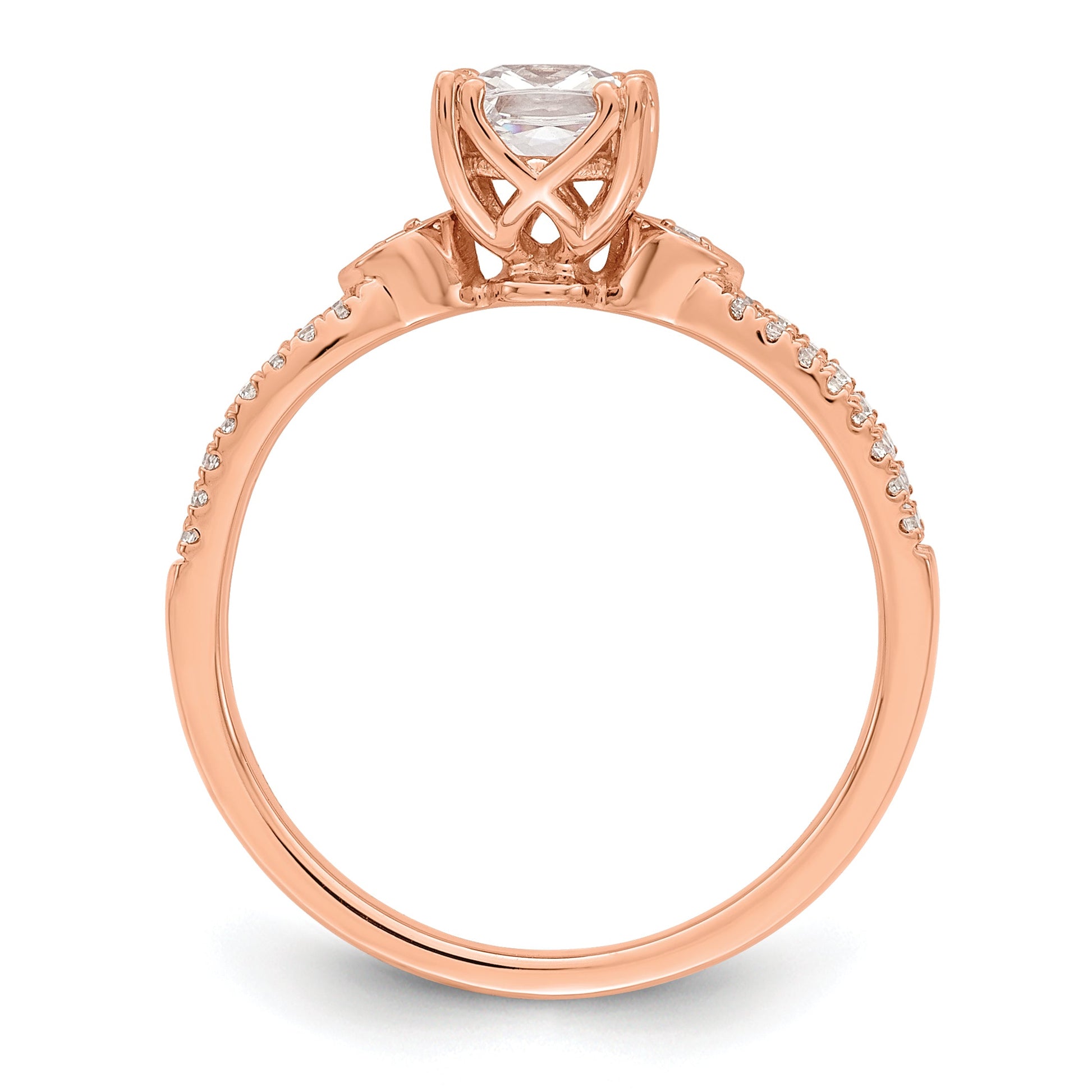 This is a beautiful engagement ring with a 0.75 carat cushion-shaped cubic zirconia set in solid 14k rose gold. The gold is real and won't change color. Our experienced jewelers carefully hand-set the CZ in the gold setting. You can choose the same design in 14k white or yellow gold. We stamp our rings with 14K to guarantee the quality. This ring is perfect for daily wear and it makes an amazing gift for someone special. You can even upgrade it to include real diamonds if you prefer. We offer a 30-day money-back guarantee and provide a gift box with your purchase. With a tapered band width ranging from 1.7 to 3.3 mm, this semi-mount ring is suitable for women's engagement.