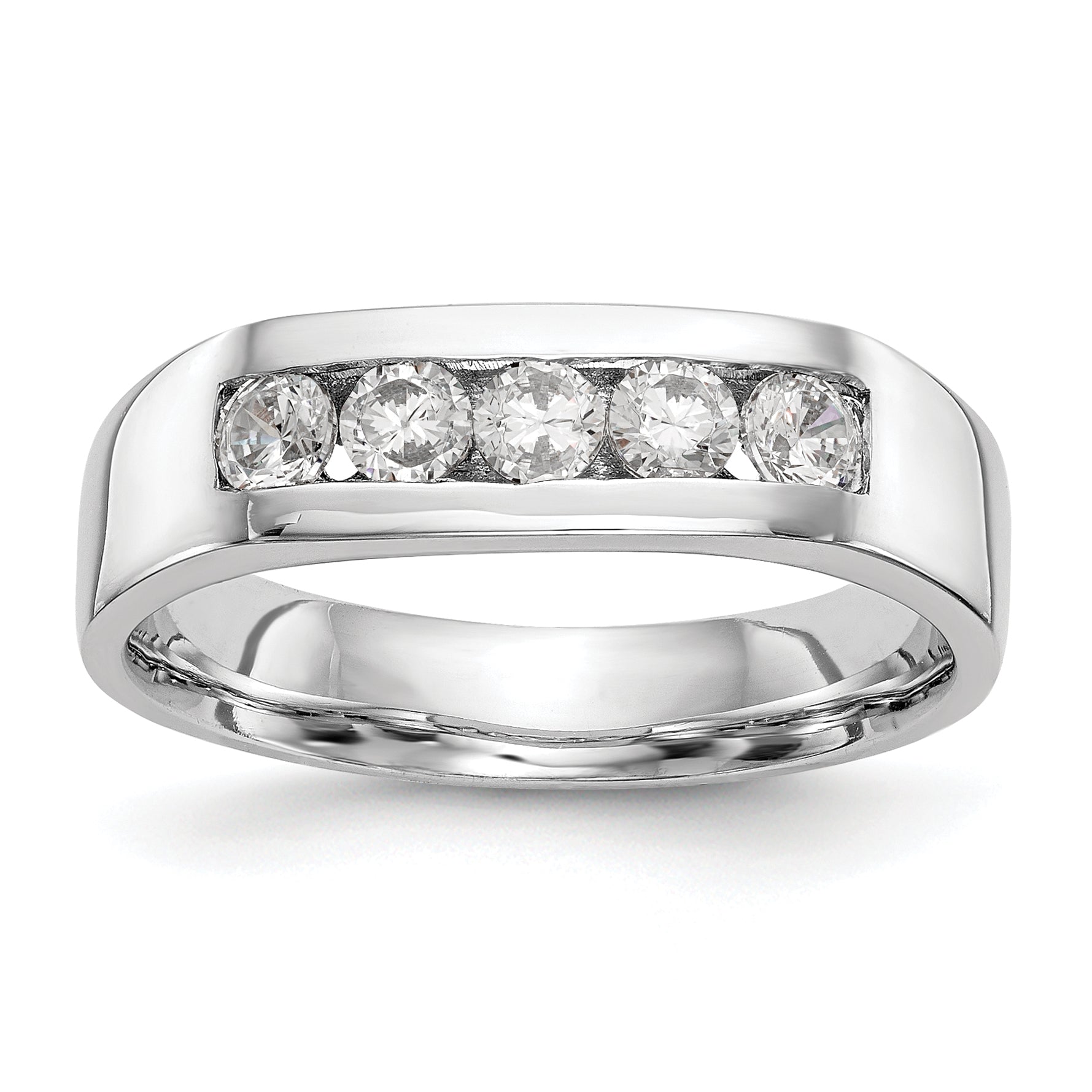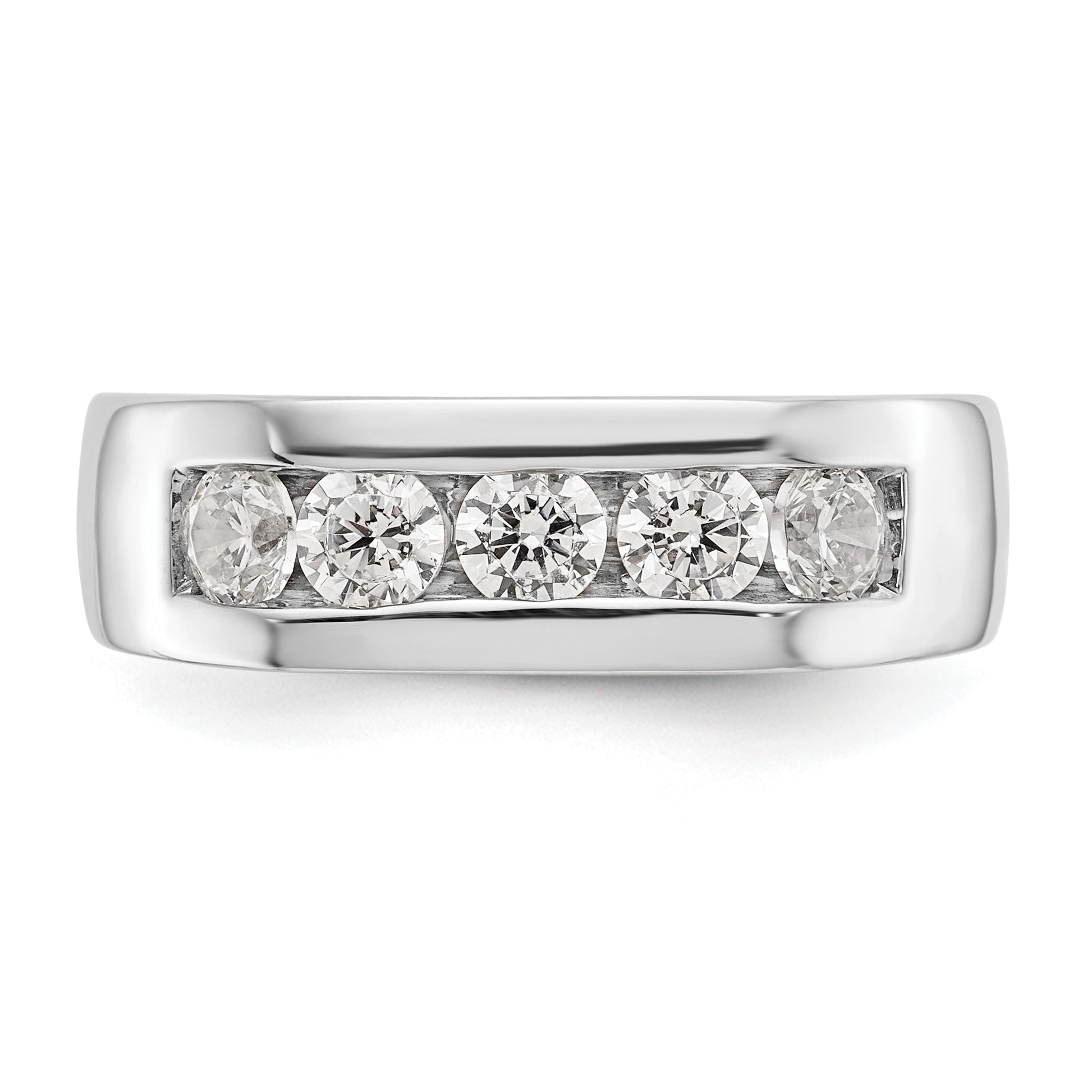 This ring measures 6.4 to 4.9mm (tapered) in band width and features 5 round stones with a total weight of 0.153ct. The ring is polished for a sleek finish and has a closed back. While this mounting is not recommended for engravings, it is perfect as a beautiful and elegant wedding band.