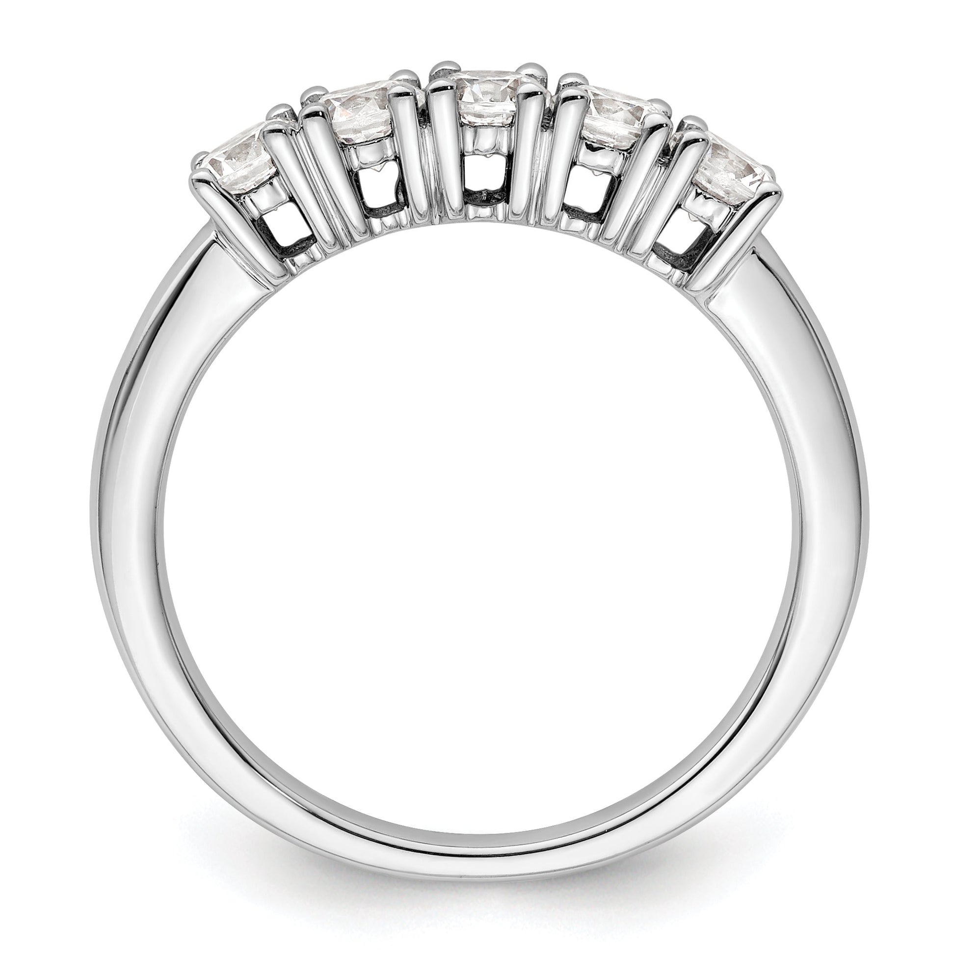 This 14K gold ring has a polished finish with five CZ stones, each measuring 3.4mm in size. The band width tapers from 3.4mm to 2.3mm and the ring is plated with rhodium for extra durability. This mounting-only ring is sizeable and features an open back. Get ready to sparkle with this must-have wedding band ring.