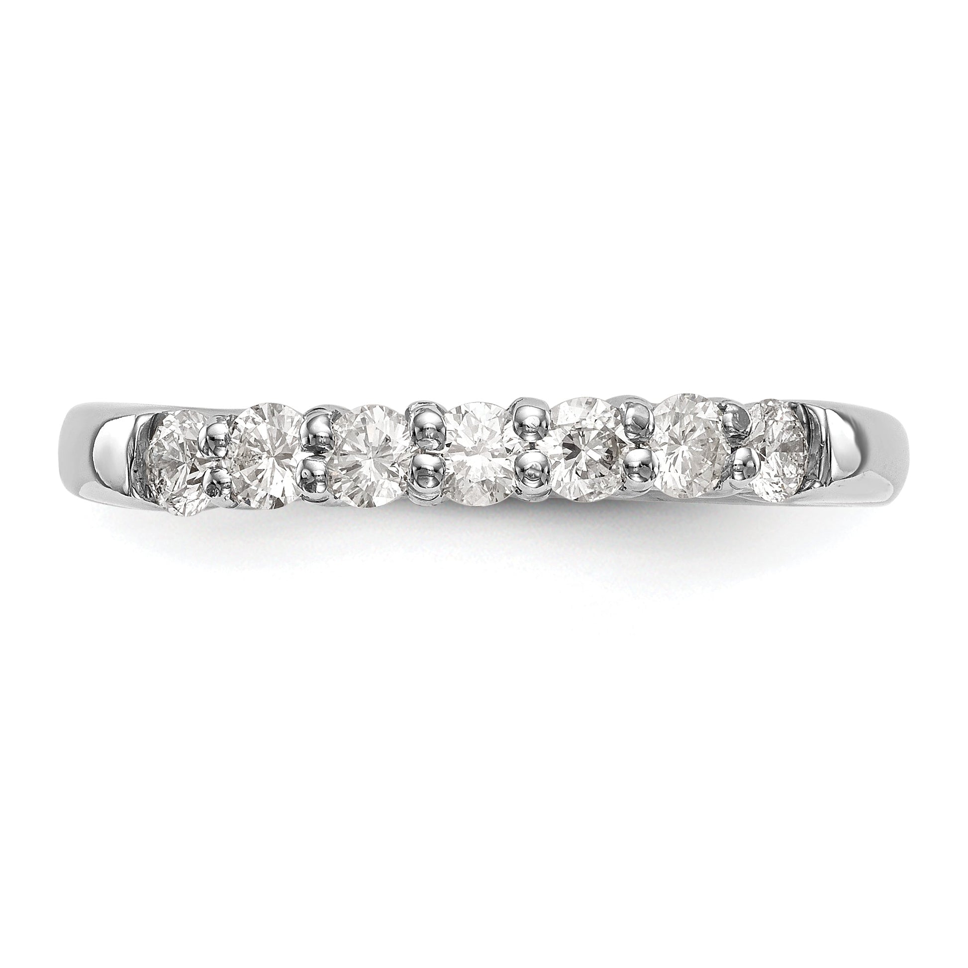 This is a 14K white gold wedding band ring with seven stones. The stones are AAA quality cubic zirconia and are set by experienced jewelers. If requested, natural diamonds can also be mounted for an additional fee. The ring is polished and has a tapered band width between 2.9 and 2.5 mm. It comes with a gift box and has a 30-day money-back guarantee. The ring is suitable for occasions like birthdays, anniversaries, graduations, weddings, engagements, Mother's Day, Valentine's Day, and Christmas. It is a safe ring to take on vacation or use as an everyday or promise ring. The product is made in the USA and has superior customer service.