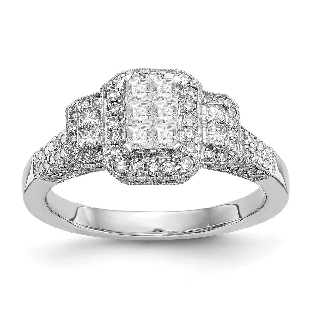 This complete engagement ring features six square CZs, four round CZs, two round 1.8mm CZs, four round 1.1mm CZs, four round 1mm CZs, 10 round 0.9mm CZs, 102 round 0.8mm CZs, and 24 round 0.7mm CZs. The stones have a total weight of 0.14ct. The band is tapered with a 1.9 to 2.8mm width and has a head height of 7.7mm. The ring is sizeable with increments of 0.25, and it ranges from sizes 6 to 8. The ring is polished and finished with rhodium plating for an extra shine. The thickness of the band is less than 1.5mm, making it comfortable for everyday use.