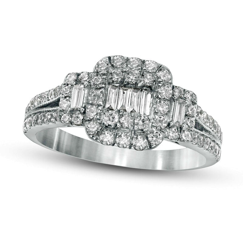 Prepare to dazzle your betrothed with this breathtaking diamond engagement ring, ideal for the confident, glamorous woman. Crafted from stunning 10K white gold, this captivating piece showcases a rectangular composite centerpiece composed of round and baguette-cut diamonds, elegantly encased within a cushion-shaped diamond frame. Complementing the center stones are petite baguette-cut diamonds, each wrapped in its own diamond halo, which flank the centerpiece beautifully. The split shank is adorned with delicate milgrain detailing and additional sparkling diamonds, resulting in a truly remarkable ring that sparkles brilliantly with 7/8 ct. t.w. of diamonds. A flawless choice for your proposal, this ring is sure to make your beloved feel like the luckiest person alive.