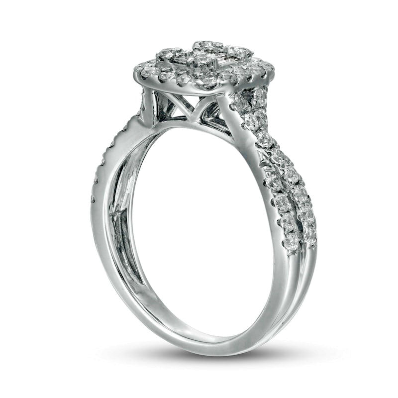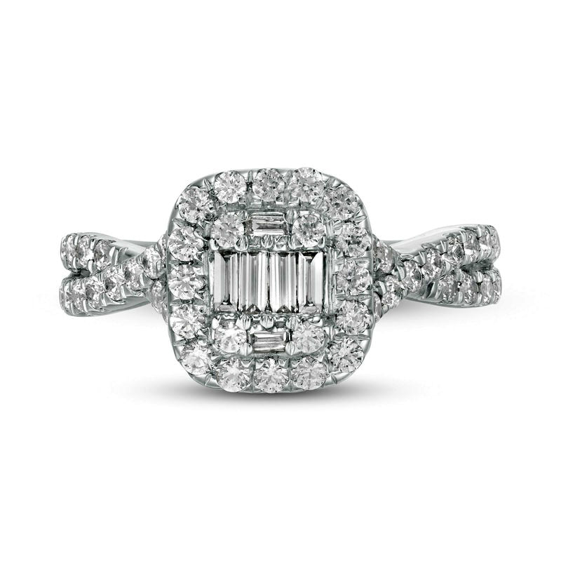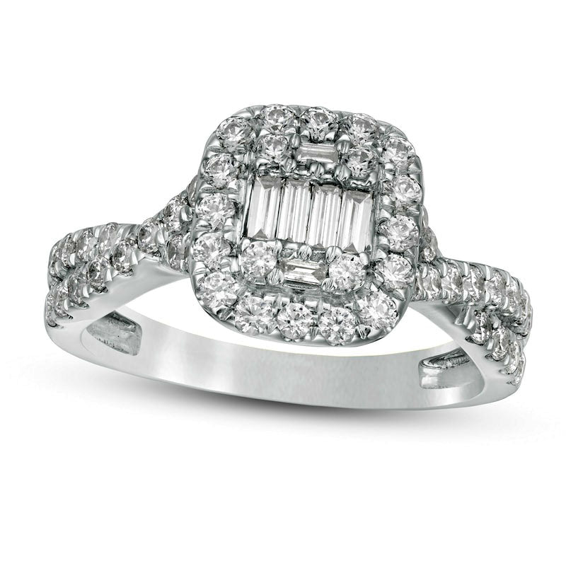 This stunning diamond engagement ring is certain to make her heart skip a beat. The intricate design is crafted from gleaming 10K white gold and boasts a distinctive cushion-shaped composite of round and baguette-cut diamonds, which is surrounded by a glittering diamond halo. The twist shank is also adorned with additional diamonds, showcasing the exquisite attention to detail of this masterpiece. With a total weight of 7/8 ct., this engagement ring sparkles and shimmers with unparalleled glamour and sophistication that will leave her breathless. The polished finish adds the final touch of class to this elegant and timeless piece.