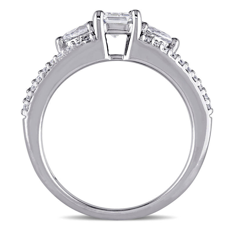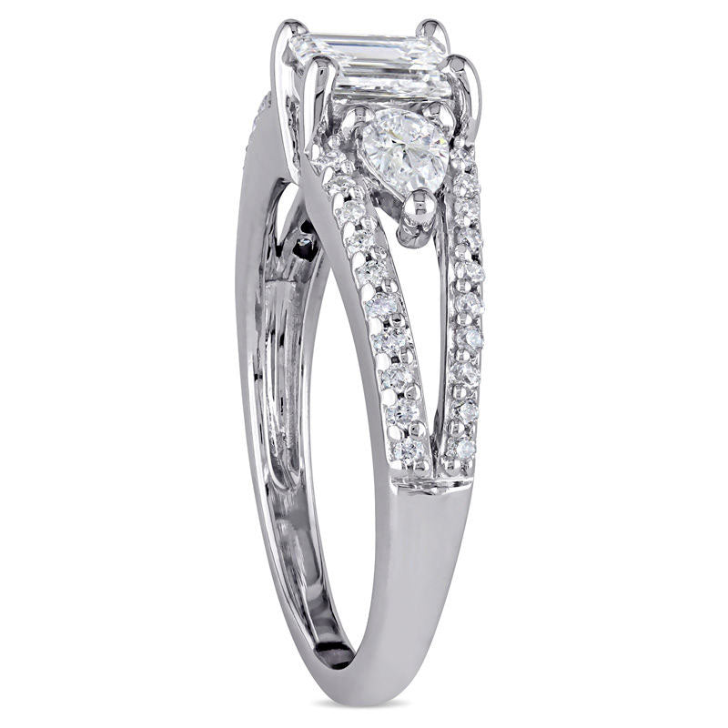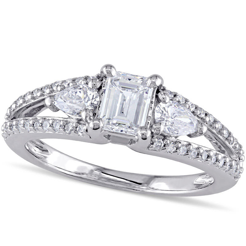 Celebrate your love with this exquisite diamond engagement ring. The stunning design features a magnificent 1/2 ct. emerald-cut diamond at the center, flanked by two charming 1/8 ct. pear-shaped diamonds. The wide split shank shimmers with ribbons of round diamonds, adding an enchanting touch to the piece. With a total weight of 7/8 ct. t.w. and crafted in 14K white gold, this three-stone engagement ring boasts a bright polished shine that will capture everyone's attention. Say "Yes" with confidence when you present this remarkable ring to your beloved.