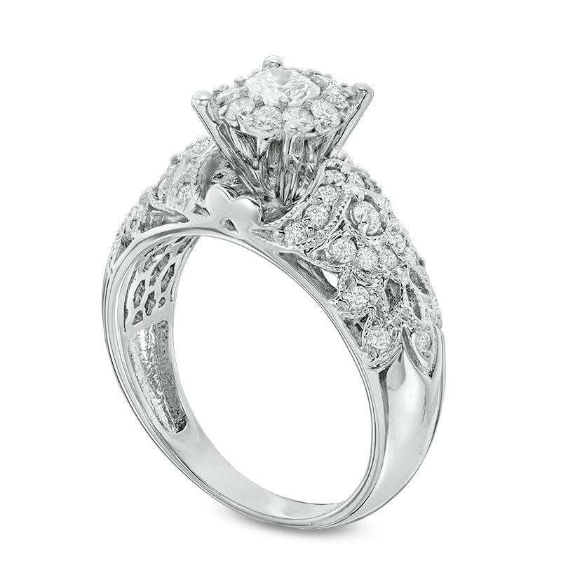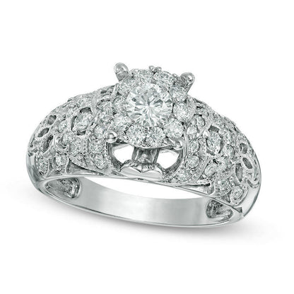 This 14K white gold engagement ring is a stunning representation of your love story. Its vintage-inspired design features a breathtaking 1/4 ct. center diamond, surrounded by a halo of shimmering diamonds. The wide shank is exquisitely crafted with intricate filigree cutouts and milgrain details, adorned with even more radiant diamonds. With a total weight of 7/8 ct. t.w., this ring exudes undeniable sparkle and sophistication. A true testament to your everlasting love, it is sure to take your partner's breath away.
