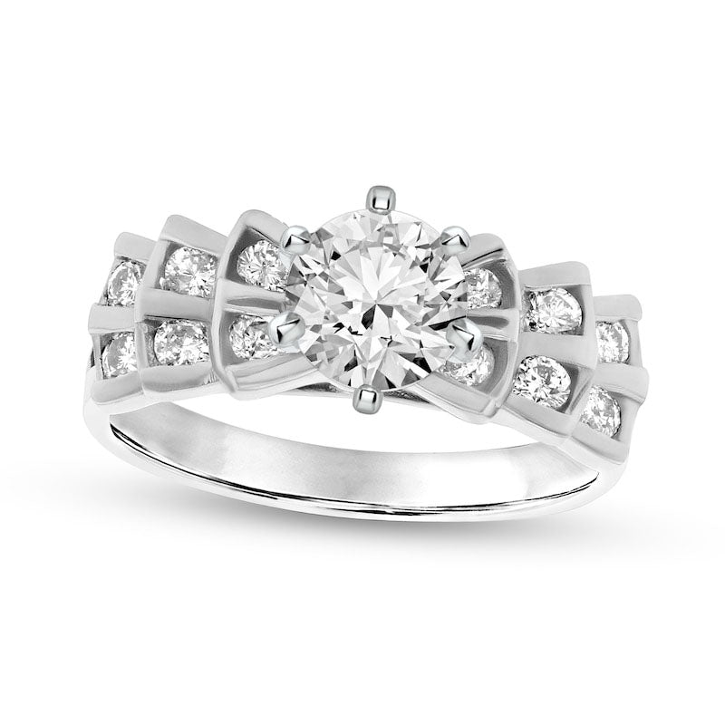 Surprise your beloved with this charming diamond engagement ring that perfectly captures her style. Crafted in 14K white gold, this exquisite piece features a whimsical design with a sculpted shank in the shape of a layered bow. The center diamond is a stunning 1/2 ct. stone with a color ranking of I and clarity of SI2, and the rest of the ring is adorned with channel-set diamonds that add to its captivating allure. With a total weight of 7/8 ct. t.w., this engagement ring is a delightful expression of your love that will take her breath away.