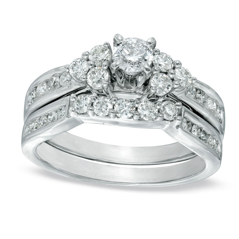Make your proposal unforgettable with this majestic and enchanting diamond bridal set. Made of luxurious 14K white gold, the engagement ring boasts a dazzling 1/4 ct. round diamond at its center. Surrounding the center stone are trios of smaller round accent diamonds in heart-shaped settings, adding an extra touch of romance. The ring's shank is also beautifully adorned with additional accent diamonds. A coordinating diamond-lined and contoured wedding band completes the set, with 7/8 ct. t.w. of radiant diamonds brightening the entire piece. This bridal set is polished to a high shine, allowing its beauty to shine for eternity.