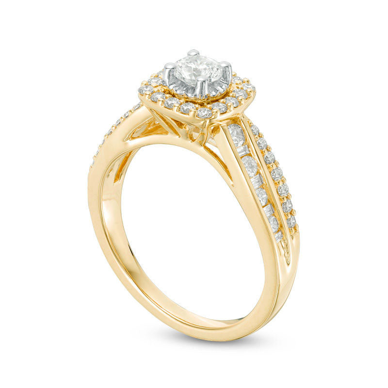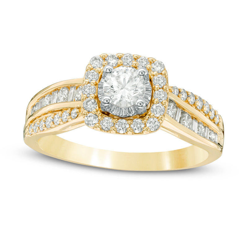 Experience the ultimate expression of love with our stunning 7/8 CT. T.W. Diamond Cushion Frame Engagement Ring in 14K Gold. This exquisite piece is the epitome of elegance and sophistication, and is sure to take her breath away. Crafted from 14K gold, this captivating ring features a stunning 1/3 ct. diamond that has been expertly set to maximize its size and sparkle. The center stone is surrounded by a cushion-shaped frame of diamonds, while two ribbon-like lines - one with round diamonds and one with alternating round and baguette-cut diamonds - elegantly line the shank. This comfort-fit engagement ring is adorned with a total of 7/8 ct. t.w. of diamonds, creating an awe-inspiring sparkle that is sure to catch everyone's attention. Give her the proposal of a lifetime with this remarkable ring that will remind her that she is the light of your life.