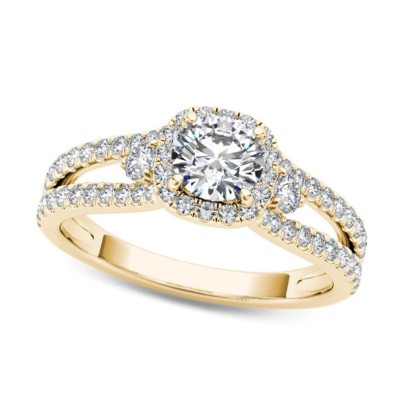Express your devotion with the striking beauty of this exceptional diamond engagement ring. Fashioned in luxurious 14K gold, this ring boasts a stunning 3/8 ct. round diamond center stone, artfully surrounded by a cushion-shaped frame of shimmering round accent diamonds. The sides of the center stone gleam with smaller accent diamonds, while the split shank of the band is adorned with additional diamonds. With a total weight of 7/8 ct. t.w., this engagement ring radiates with a brilliant sparkle and a polished finish that will leave her breathless.
