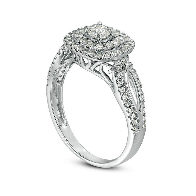 Looking for a stunning engagement ring to symbolize your love story? Look no further than this sophisticated and dazzling diamond ring. Crafted from cool 10K white gold, this ring features a glittering 1/5 ct. diamond at its center, elegantly surrounded by a double cushion-shaped frame of diamonds. The shank of the ring is equally stunning, with sculpted loops that twinkle with diamonds and polished details that add even more interest. With a total of 7/8 ct. t.w. of diamonds and a brilliant, polished finish, this engagement ring is sure to captivate and impress anyone who sees it. Start your happily ever after with this breathtaking ring.